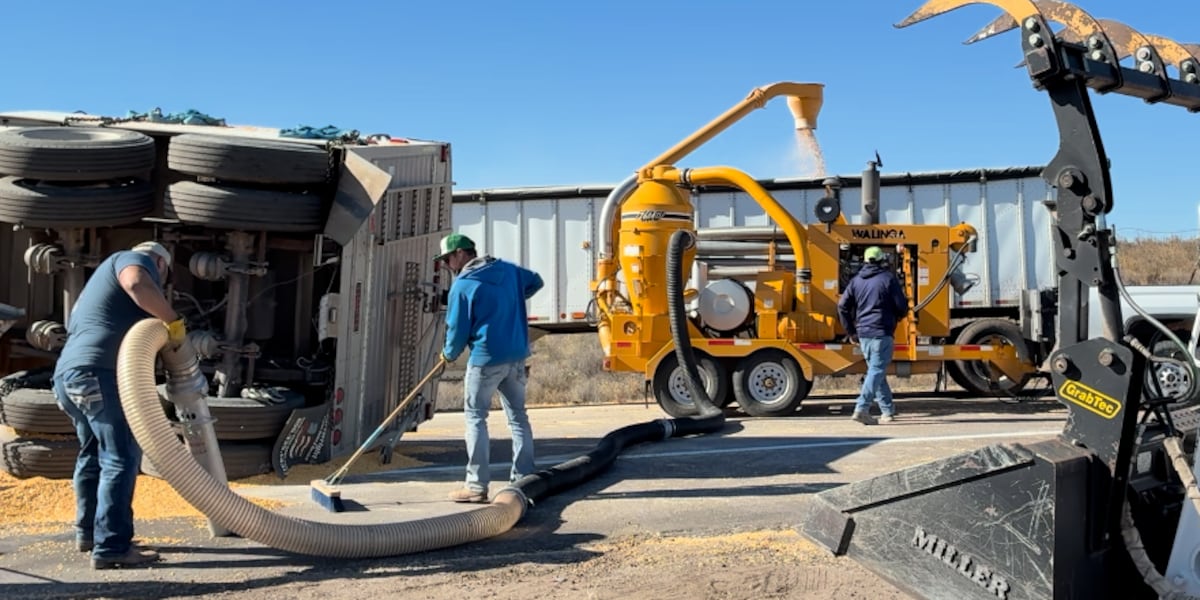 A vacuum was brought in to clean up grain that had spilled in the road, and to get it into another truck.