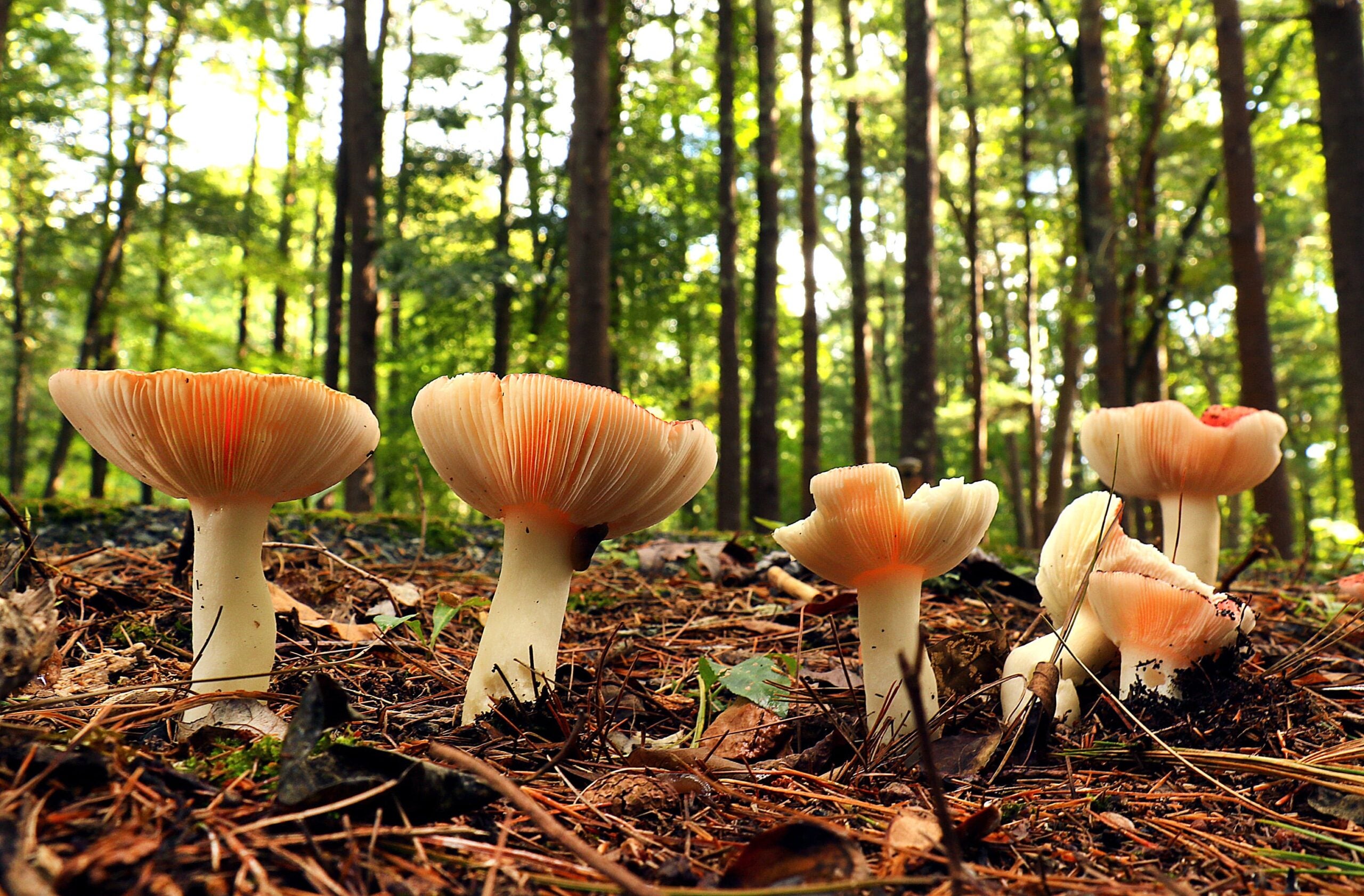 Red russula mushrooms rise from the pine-needle covered ground in a front yard in Pembroke. – John Tlumacki/Globe Staff
