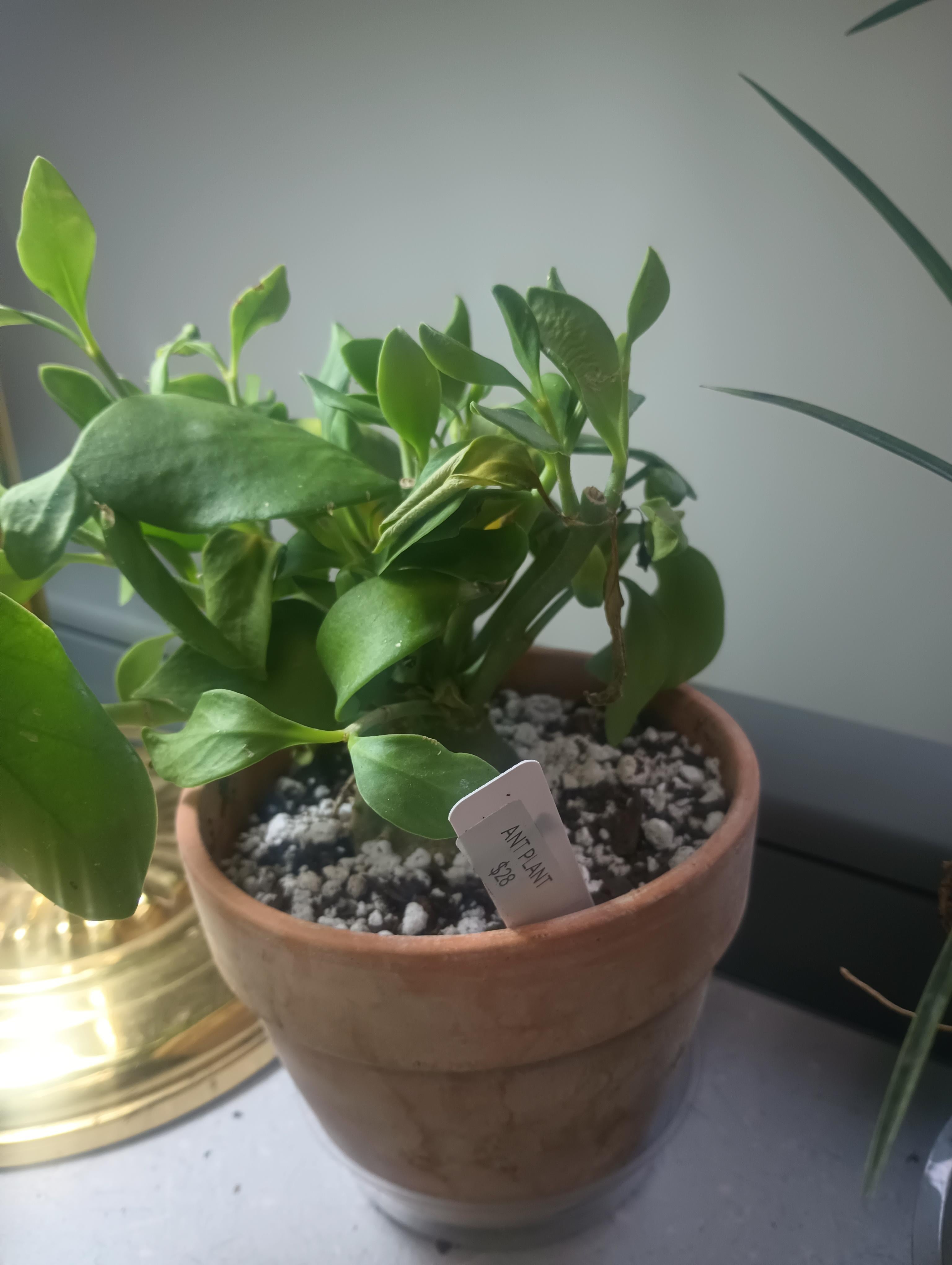 This is my first Ant Plant. I've had it about a month, gets a medium amount of filtered light on my fresh, about 9 inches from a 40w grow bulb as supplemental. I have it in the peat/perlite mix I purchased it with. I've kept it fairly dry, but I'm wondering if maybe it needs more water than I've provided. Please critique whatever might help me keep this happy!