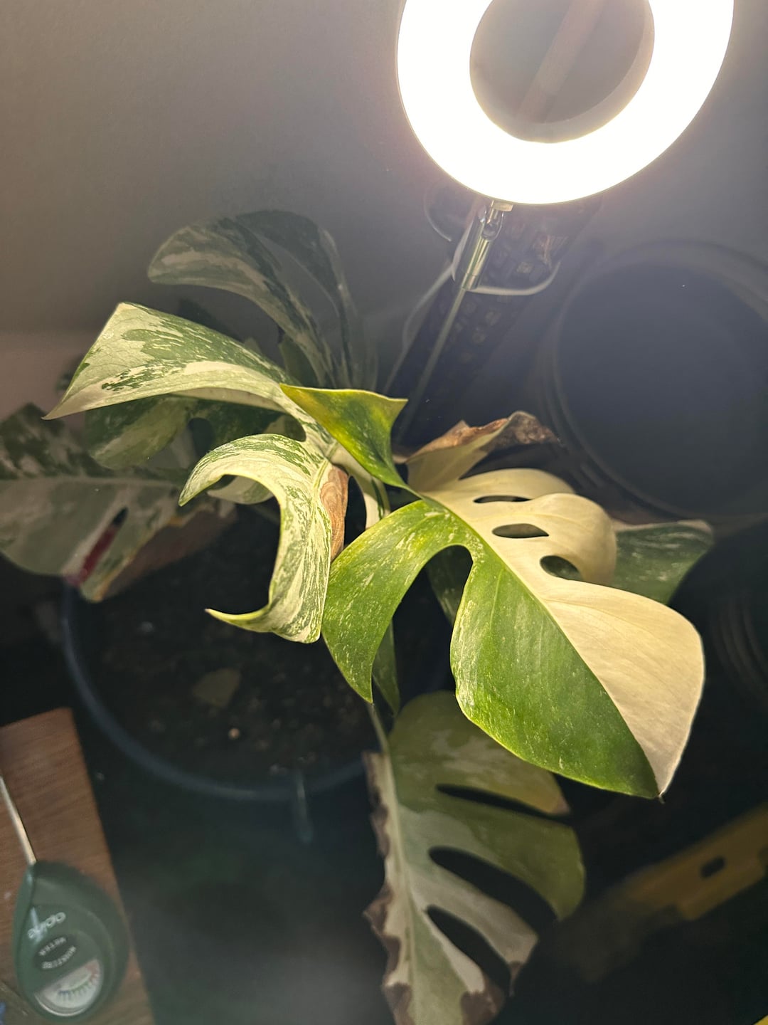 Ok I’m struggling I would say km fairly good with plants except this one ☹️ I have two grow lights one I turned off for this photo and I’ve been feeding this plant food (superthrive) and I’m not overwatering I water once a week and check with a water gauge, and I have good drainage.. what should I be doing?? I know some browning eventually is inevitable but I’m giving up at this point