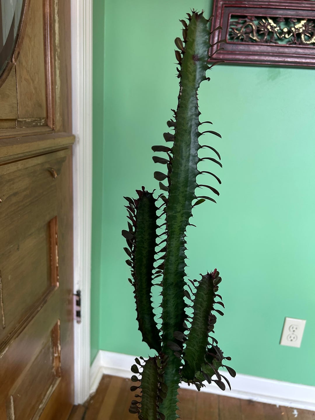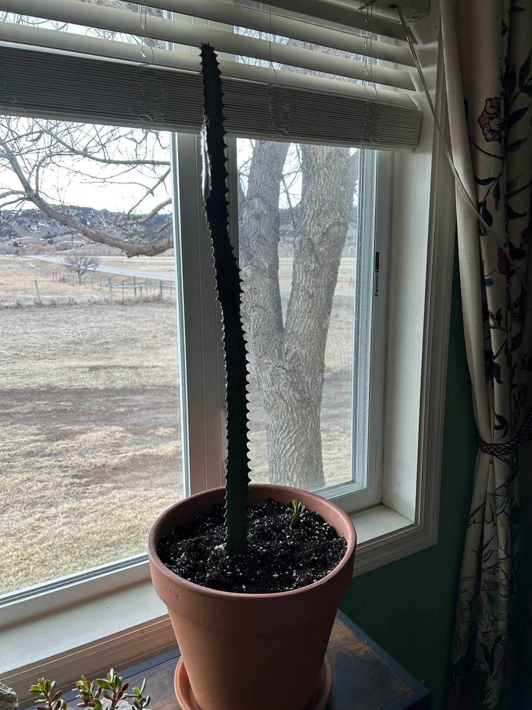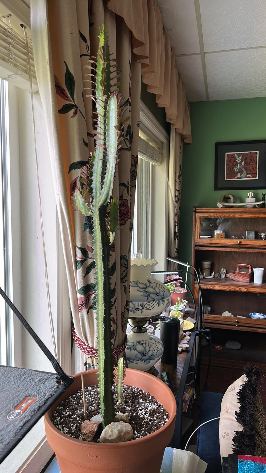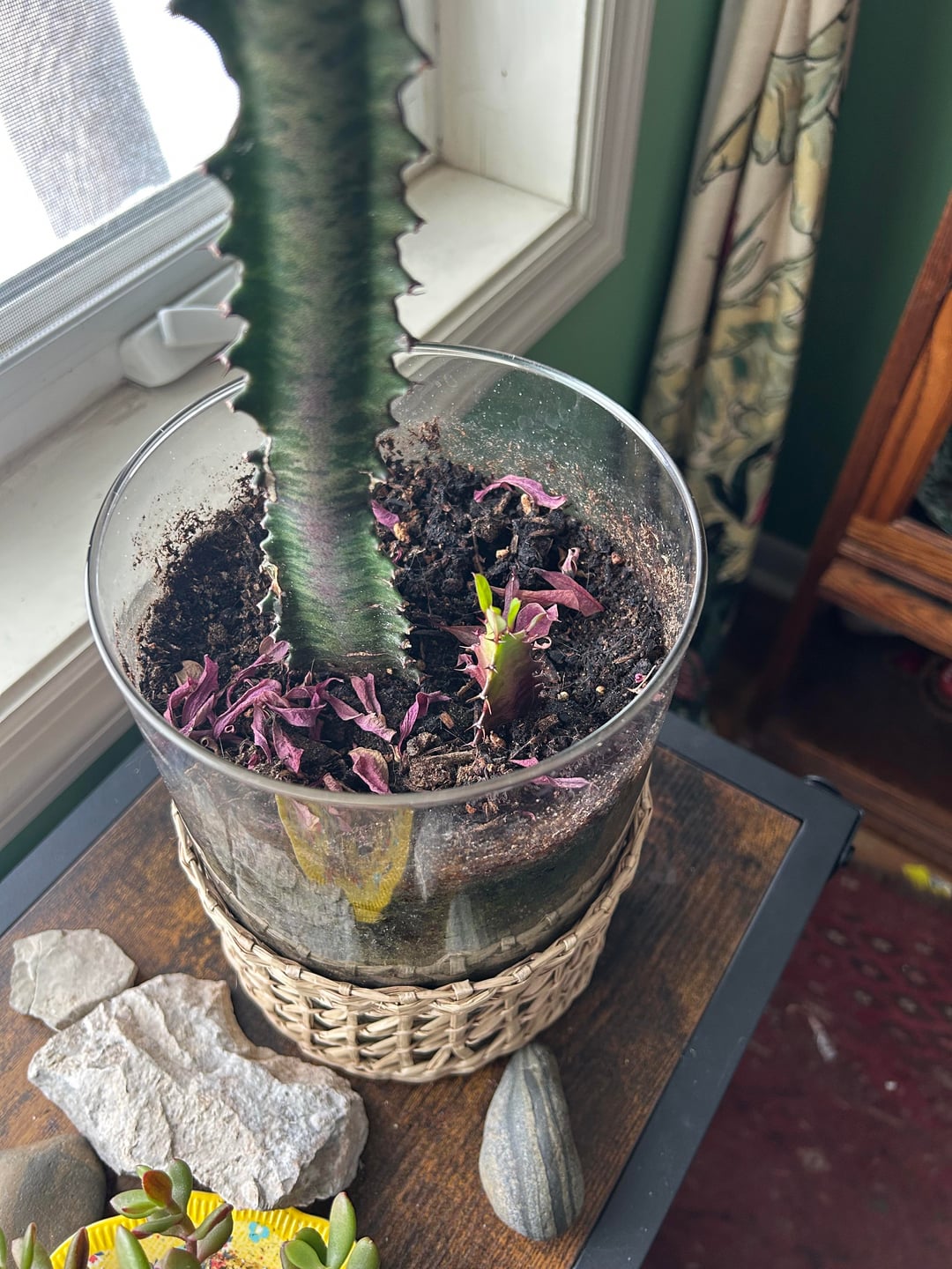 Pics 2 & 3: March 2025 – I ask for advice because all the leaves turned purple and fell off. Took to advice to transplant. Watched several Euphorbia care videos, feeling confident.