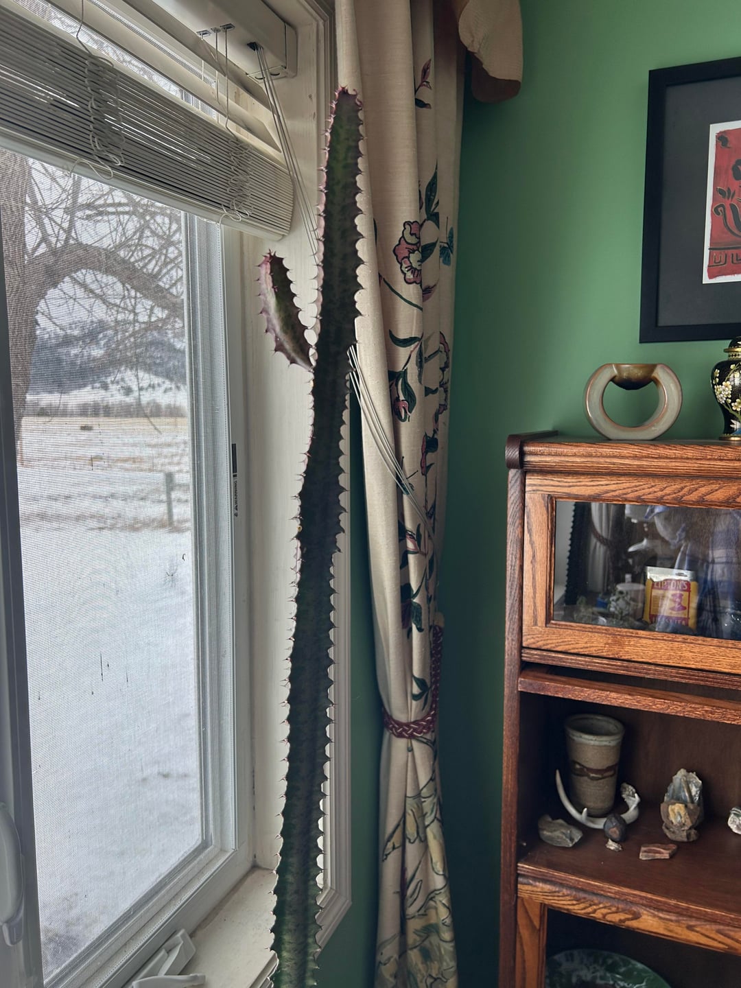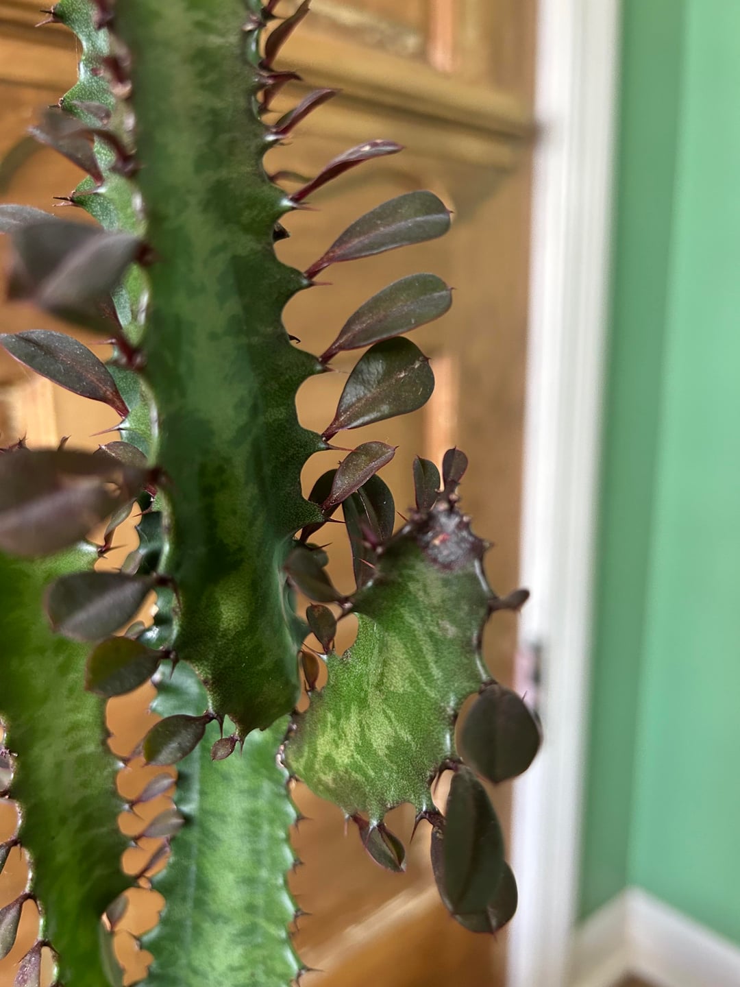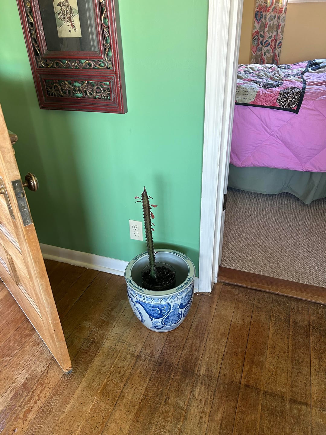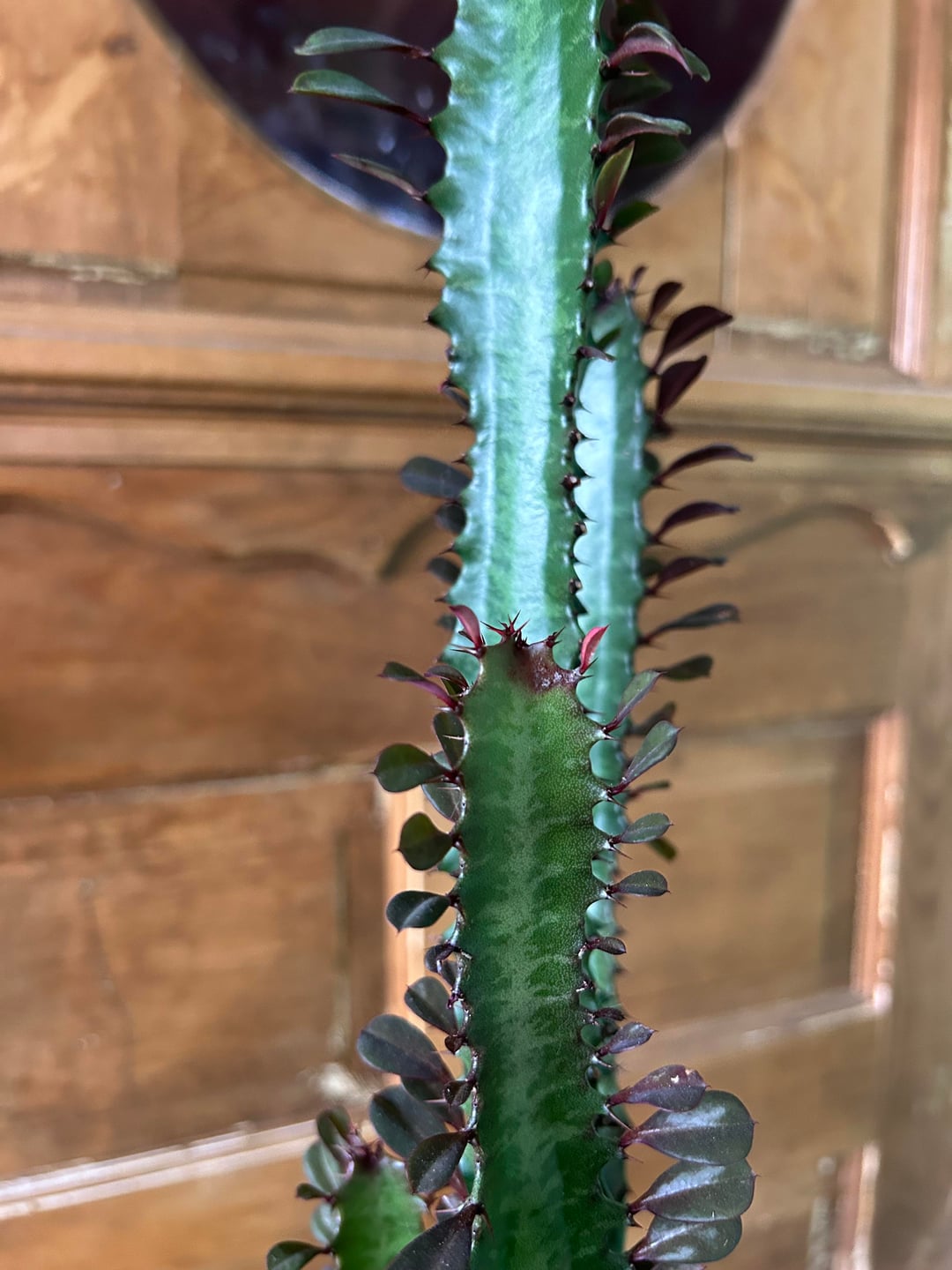 Pics 2 & 3: March 2025 – I ask for advice because all the leaves turned purple and fell off. Took to advice to transplant. Watched several Euphorbia care videos, feeling confident.