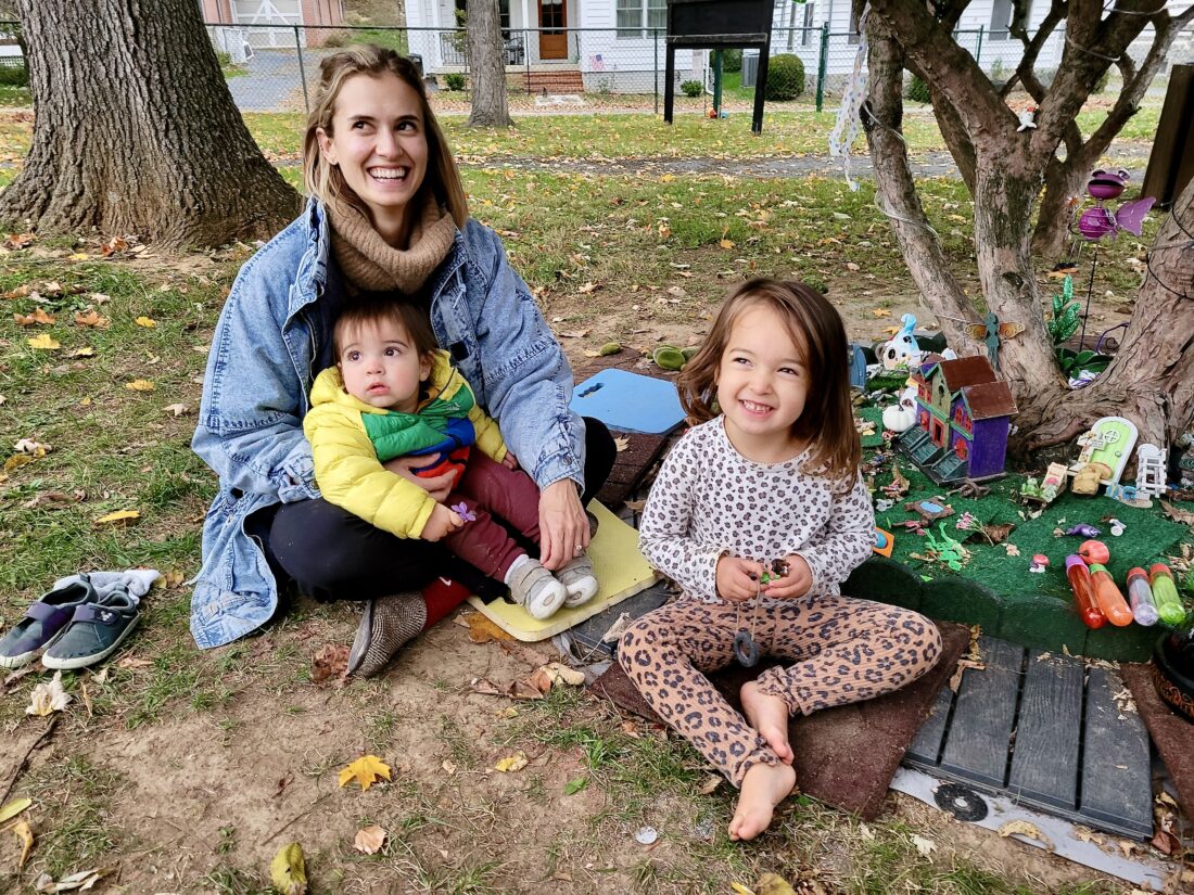 From left to right, Shepherdstown resident Grace Dwyer sits with her one-year-old son, Cormac, beside her three-year-old daughter, Theo, as they look up at a fairy hanging from the tree above the Bane-Harris Commemorative Park fairy garden. Photo by Tabitha Johnston