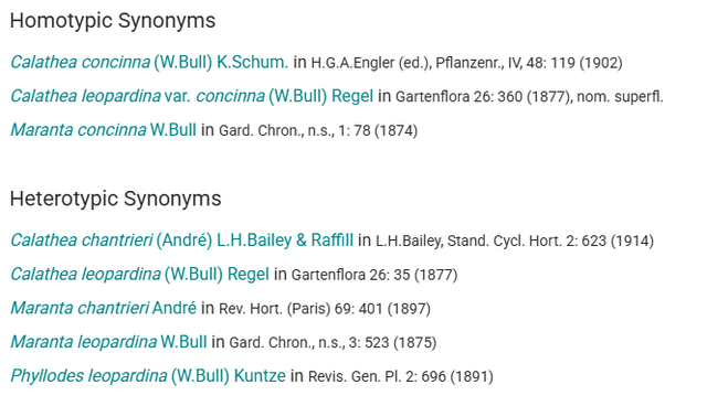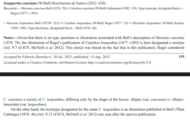 Goeppertia concinna is Goeppertia "Leopardina". This is a fact, not an opinion, Mariana Naomi SAKA in 2015, when most of Calathea got reclassified into the genus Goeppertia, talked about this issue. Quote "—Given that there is no type specimen or illustration associated with Bull’s description of Maranta concinna (1874: 78), the illustration of Regel’s publication of Calathea leopardina (1877: t.893) is here designated a neotype". This is an official fact, not someone random publishing her opinion. I will put the picture right below (or up idk where it will appear).