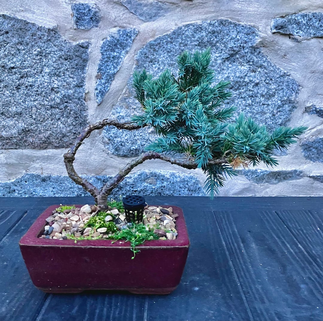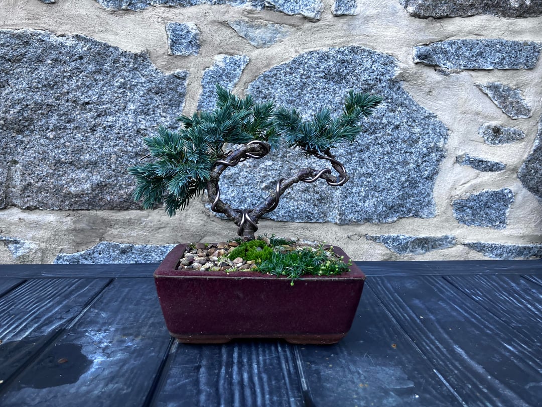A young garden centre juniper I’ve been working in since 2024. It’s never going to be an “amazing” tree but I like the pot/foliage colour combo and I’m pleased with how the restyle went – except I half snapped the right hand trunk when bending. It’s in the hands of the gods now – if it dies over the next few months it will become a jin