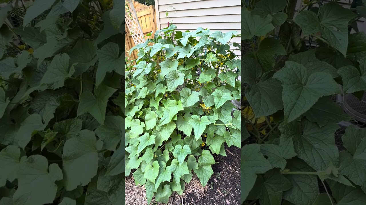 The cucumbers this year are amazing. And I really love my trellis because it saved me so much space on my tiny little garden. Look at this. All this bunch of cucumbers hanging. Yeah, it’s like a a little slanted thing. how it works. This is a little Look how healthy they are. And there’s a bunch of cucumbers over there just hanging on another side. This is how it looks. I think I only planted six of the cucumbers and they turned out so good. So, I’m going to pick it up now. is I’ll put the link where I bought it because it only takes a small section of the garden they climbing up and then you see like on the top they just can hang down and that’s it. Yep. All this nice yummy cucumbers.
