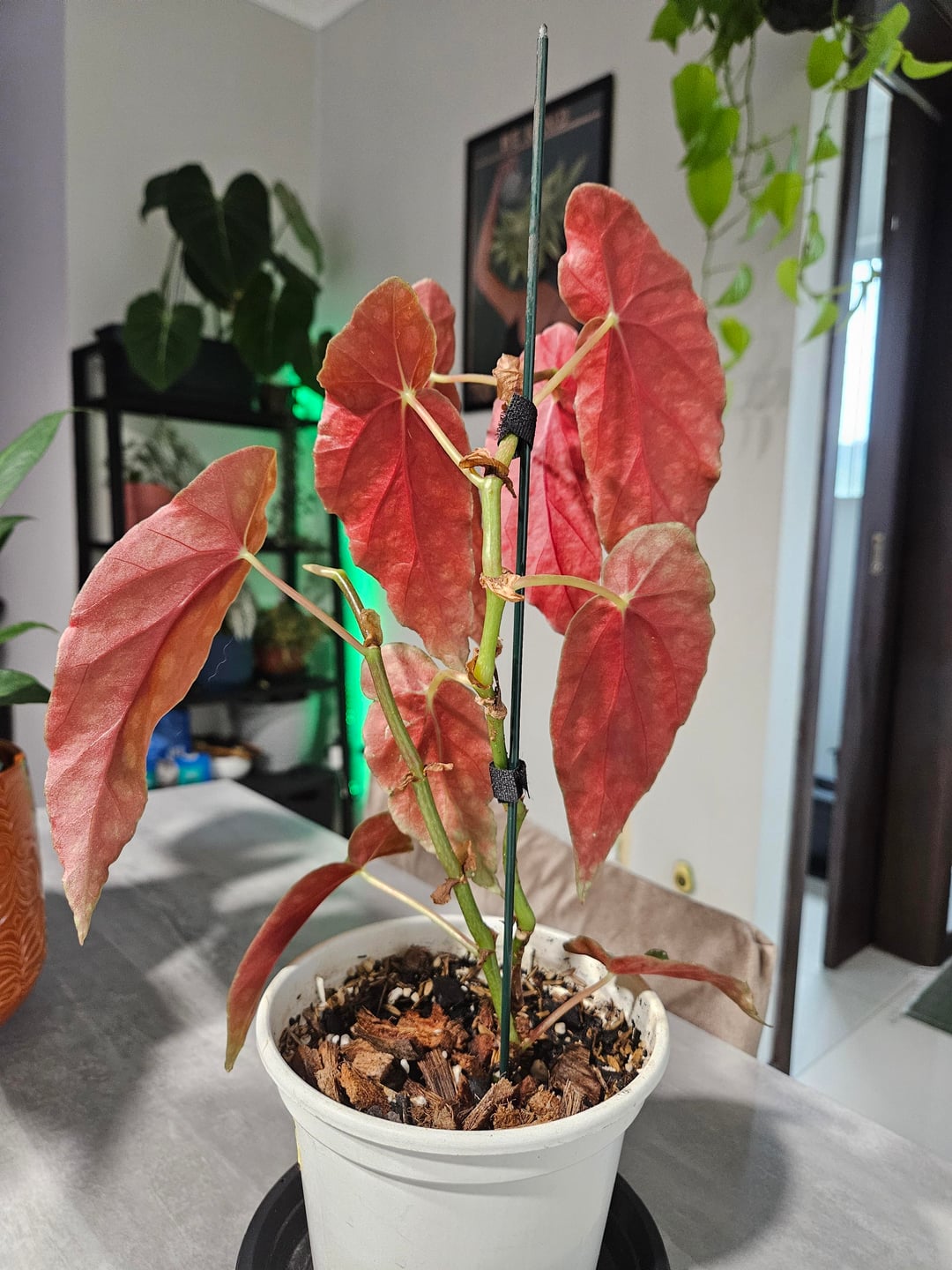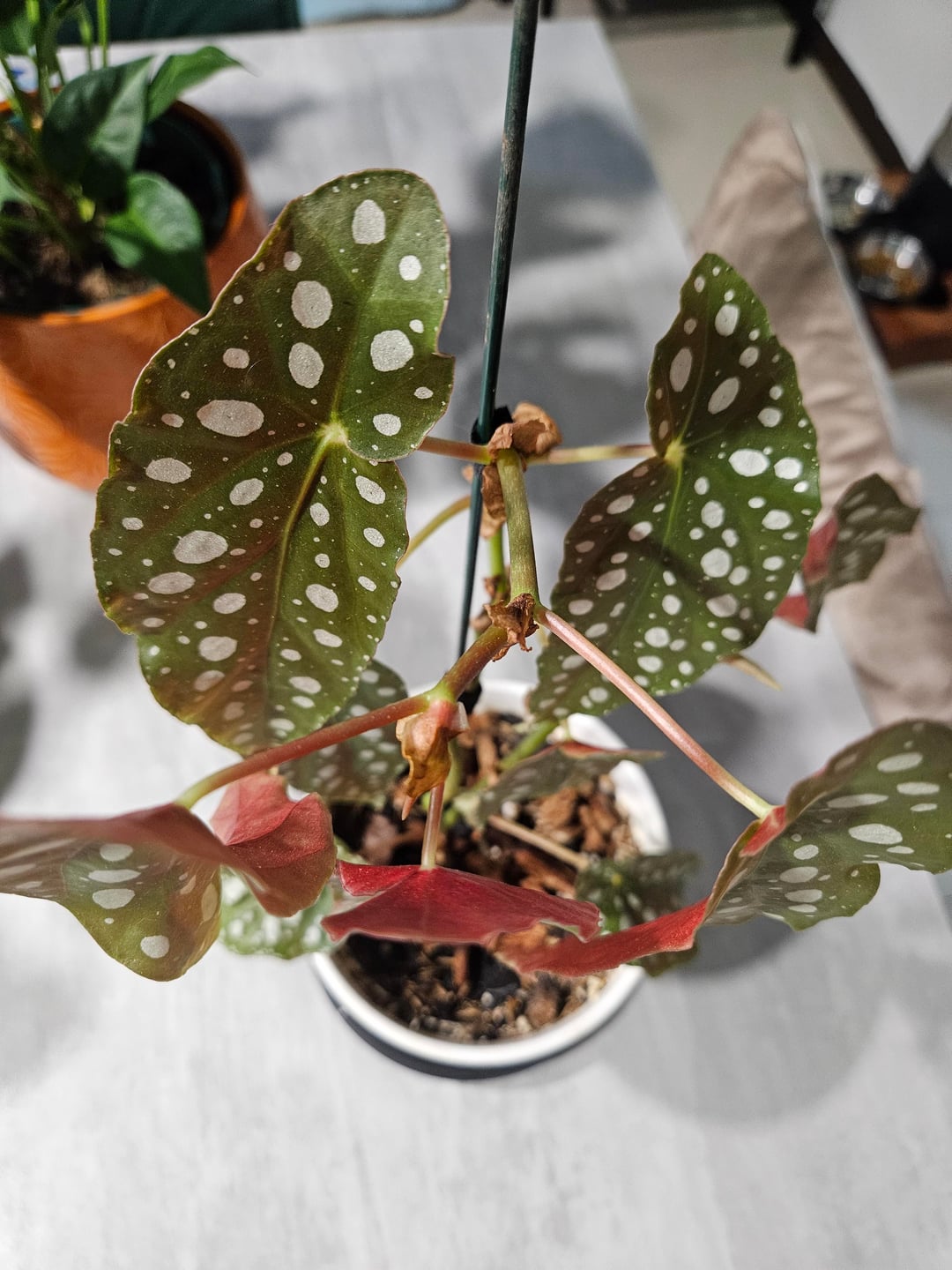 Looks healthy, but very one sided. All of the leaves are turned towards the light source. If you turn your begonias on a regular basis, they will grow more evenly and won’t need stakes.