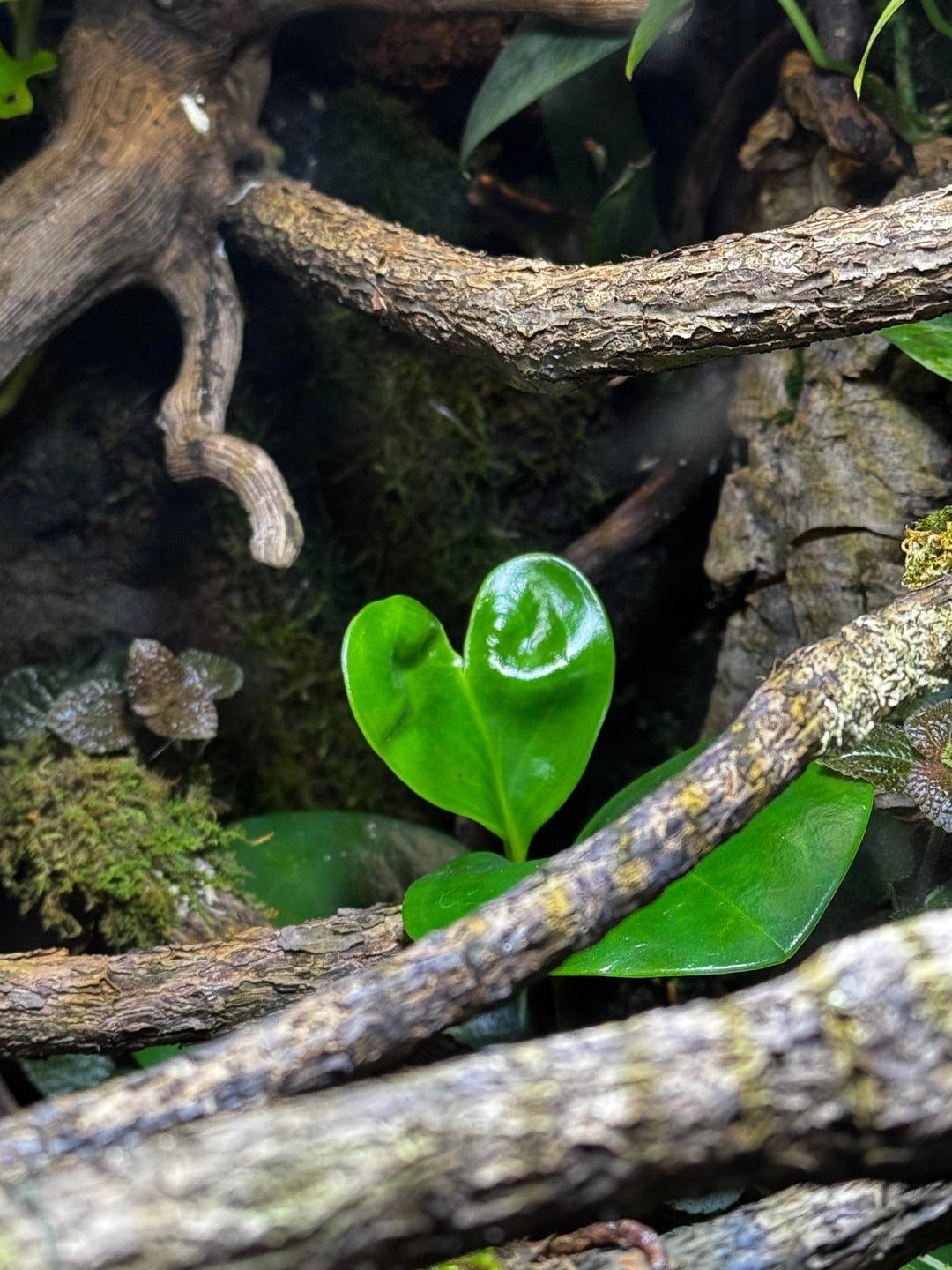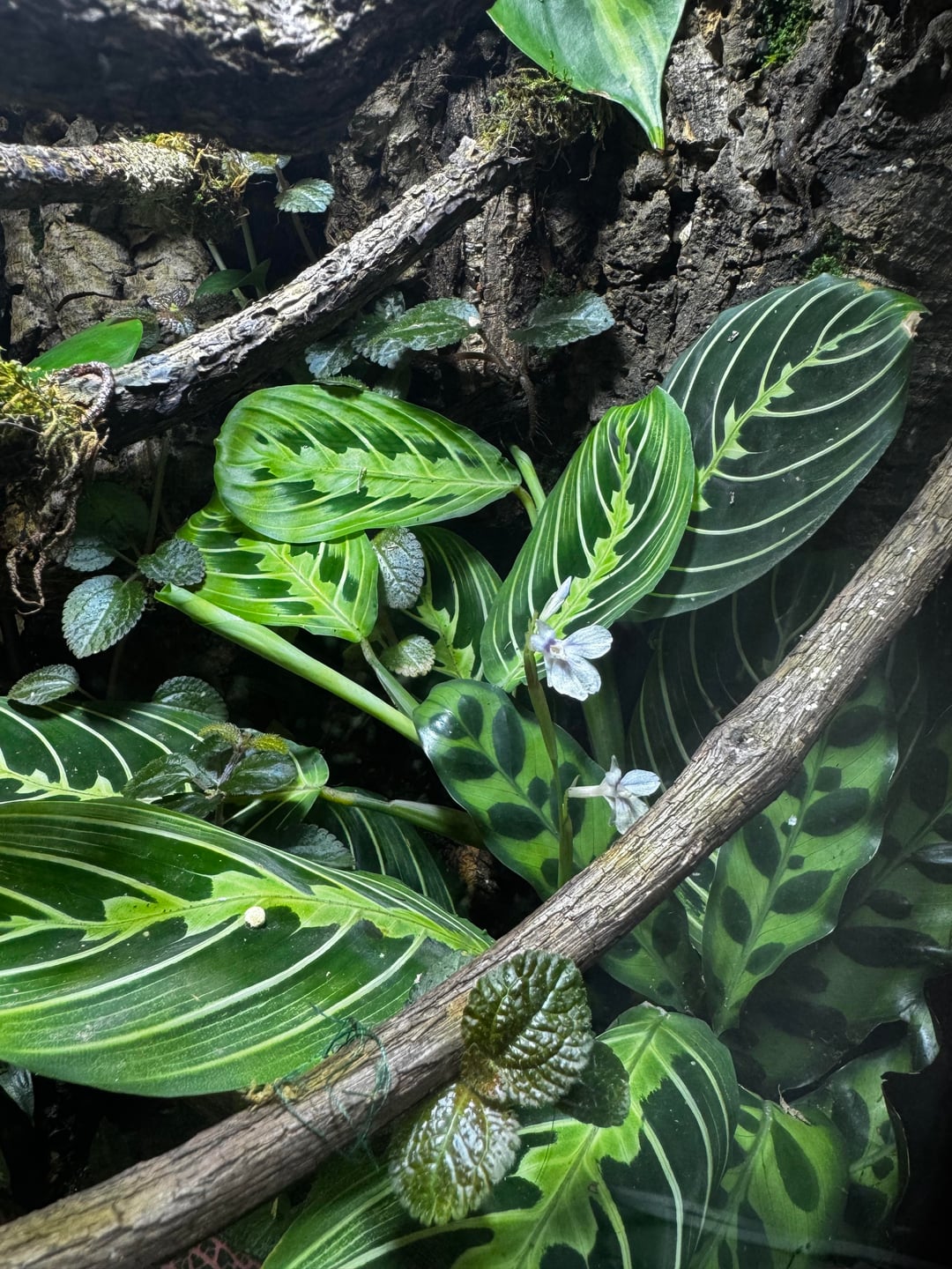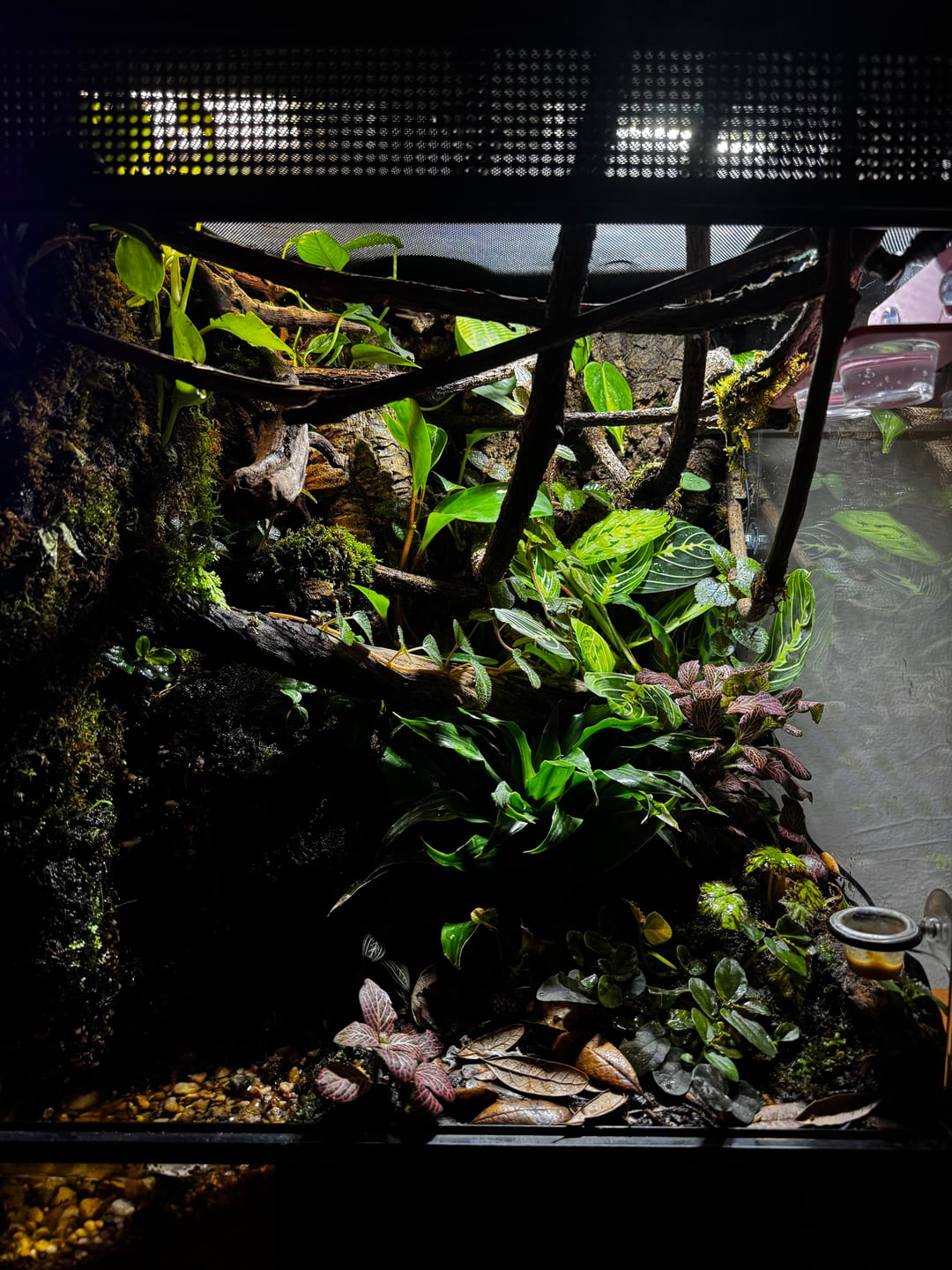 I spent a full two years researching before even starting this tank. From the very beginning, I had to figure out how to properly section off the water area so it would stay contained in one spot. The setup includes a running waterfall system, though it’s not on constantly. Everything is on a timer to keep things running smoothly. Even the misting system is programmed to spray twice a day for 5 and 10 seconds. The waterfall only runs at night to mimic the natural humidity spike they’d experience in the wild. I also use a temperature and humidity monitor that I track and record throughout the day. Every detail was thought through, right down to the plants, which are arranged from smaller in the front to larger in the back for a natural depth effect. I’m also super aware that crested geckos aren’t strong swimmers, which is why I carefully filled the water area with rocks that slope toward the land. With the rocks in place, there’s no possible way for her to drown. I even added mini lily pads to help break the fall, just in case. This isn’t just a tank thrown together. It’s the result of years of research, planning, and patience.
