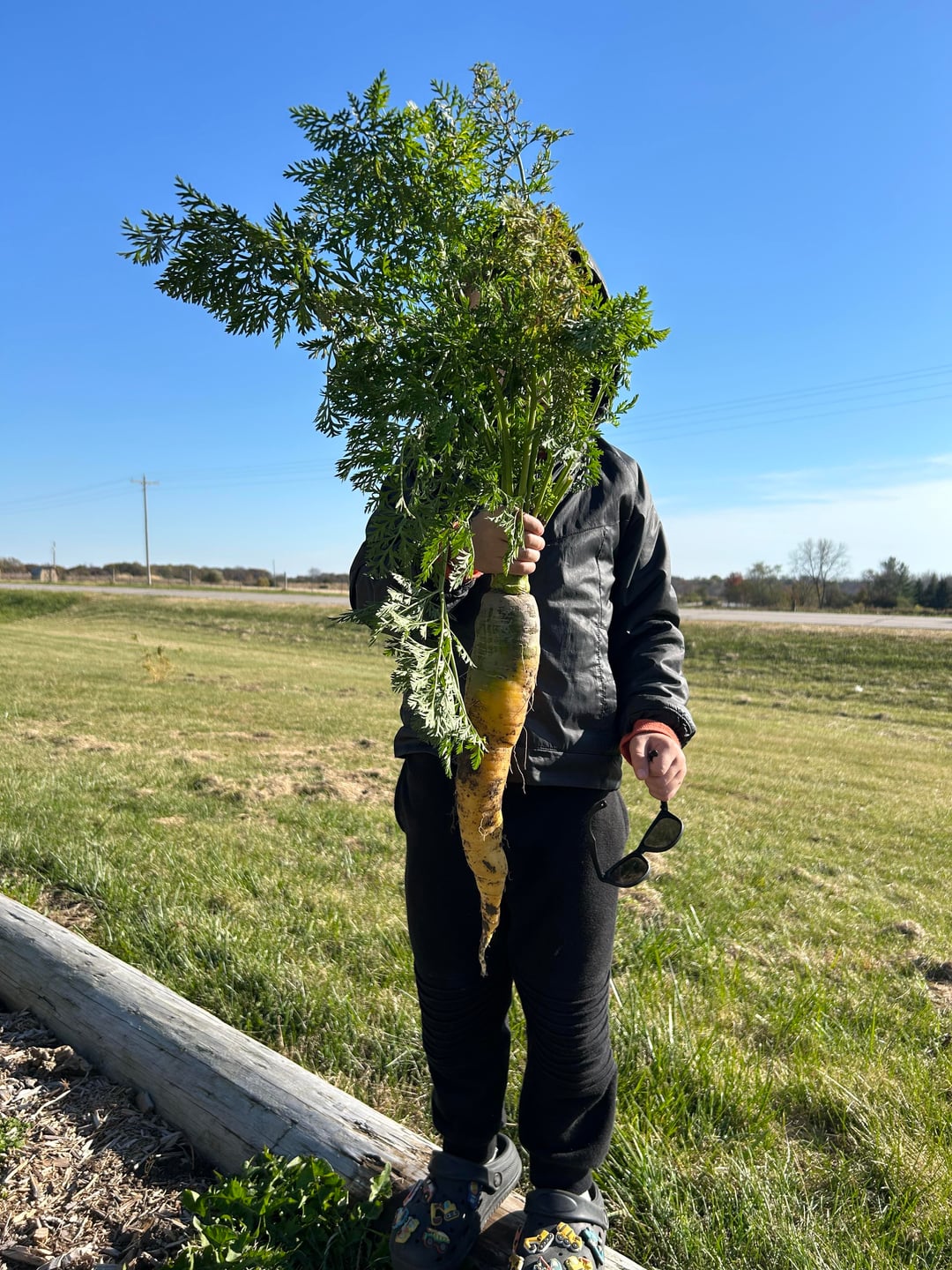 Pulled some carrots for supper the other night… I knew they were big from their tops but shit. They surprised me! Only used 2 for chicken noodle soup and have about 10 more in the ground still. Planted in August. 2nd picture is carrot with 5yr old. Regular Kaleidoscope blend by Burpee I believe. Iowa 5b
