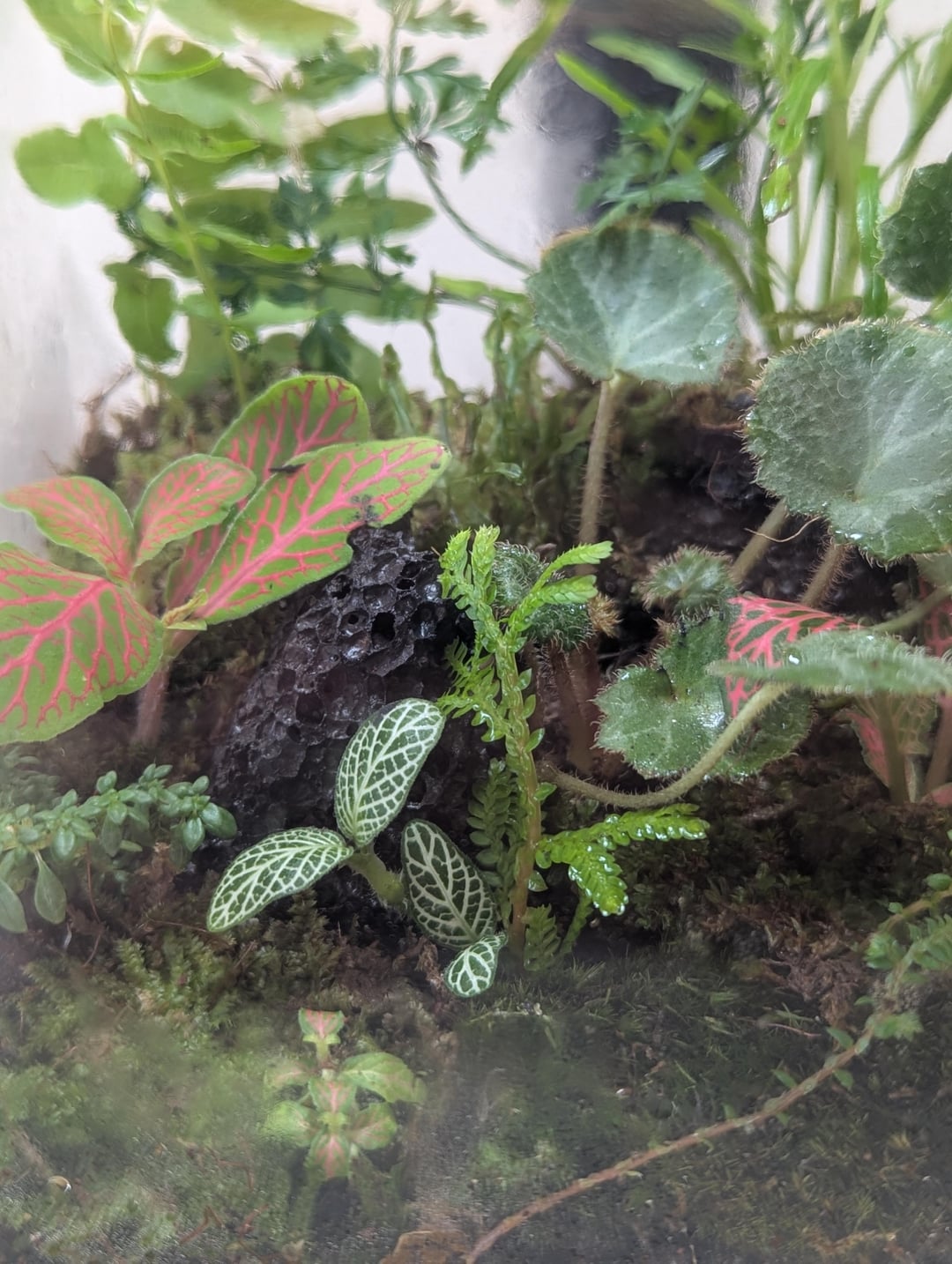 Plants used: 4 different kinds of fittonia, strawberry begonia, hemigraphis, fern, bolbitis difformis, pilea microyphylla, salaginella ucinata, pincushion moss, hypnum sheet moss and two other mosses that I don't know the ID of.