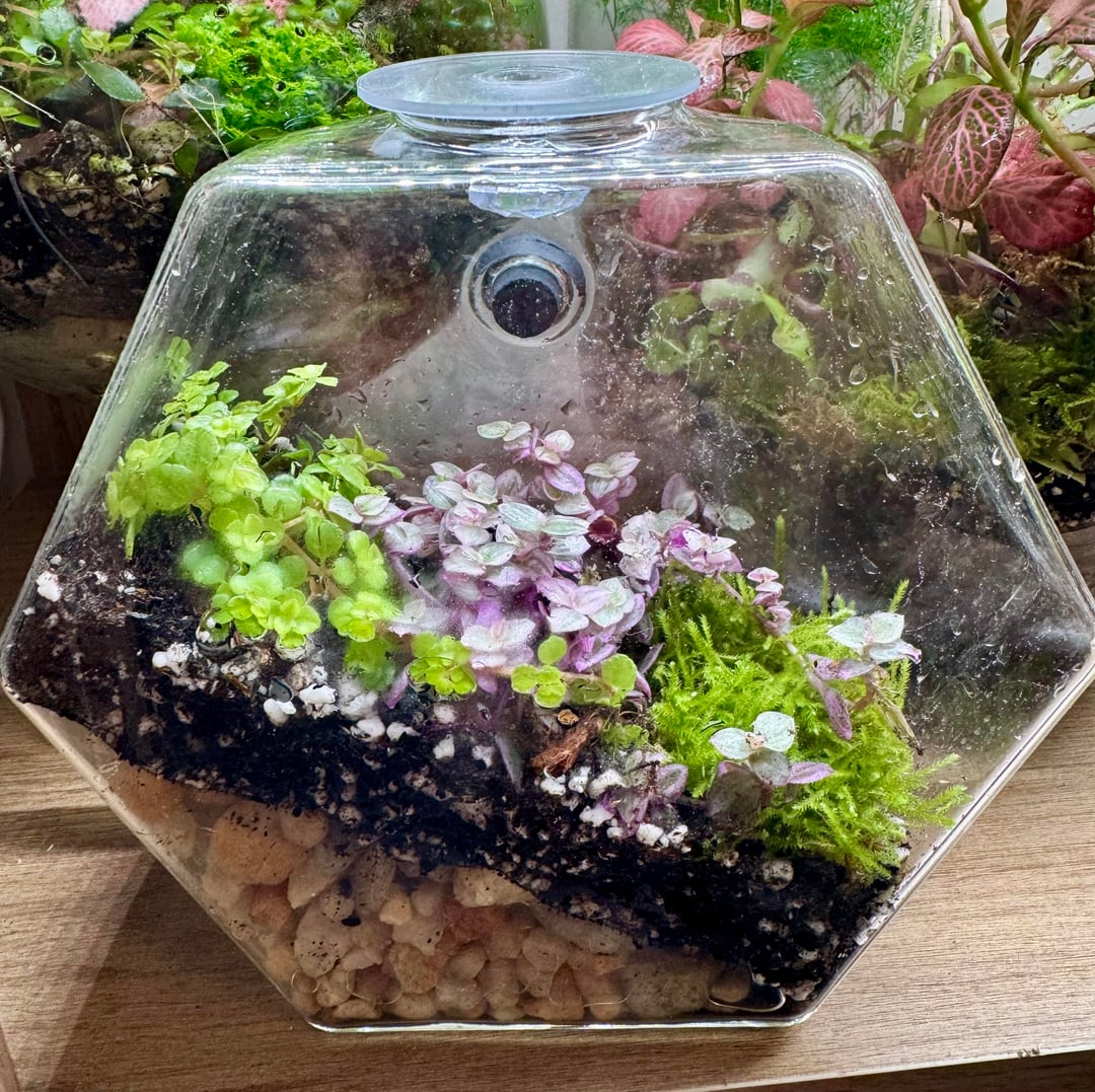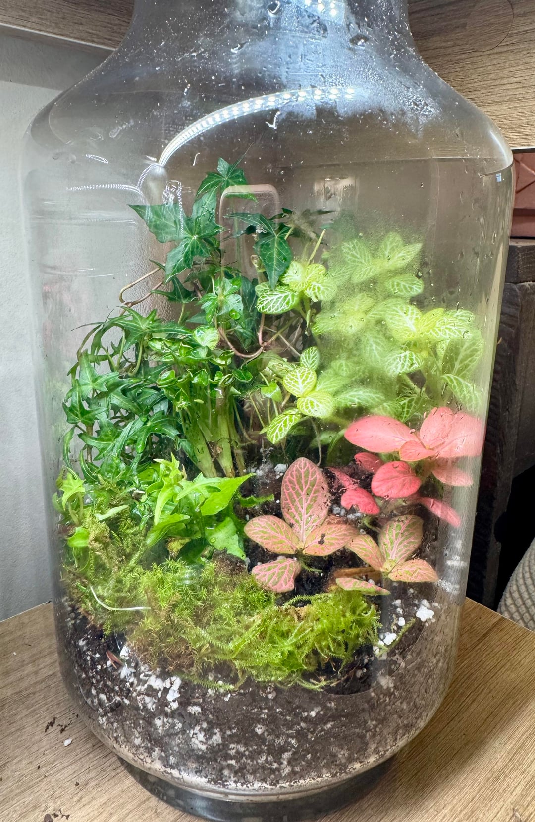 Substrate- I experimented a little each time I built a batch of terrariums. Mostly peat based, lots of perlite. Worm castings. Bark. Some have charcoal, sand, coco coir chunks. My recent batch I used fox farms ocean forest potting soil, added perlite and bark.