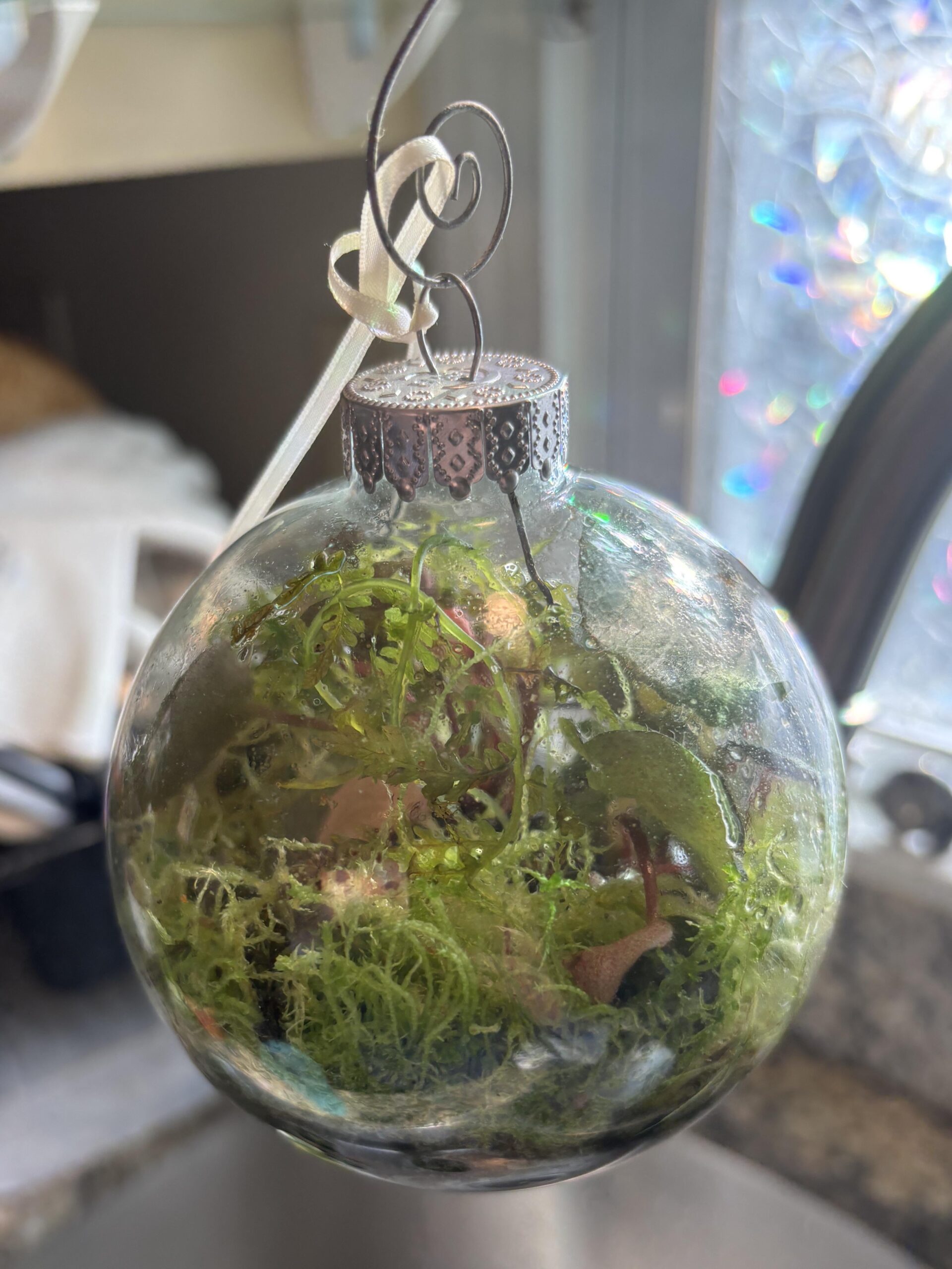 I just opened it up for the first time and pushed down the moss with a chopstick as it had mostly taken over the other plants. I just love moss💚🌿 by Nematodes-Attack Horticulture Terrariums 3 Comments Aine_Ellsechs 2 days ago That’s pretty cool. Nematodes-Attack 2 days ago Made November 2024 Saxifraga stolonifera and moss South facing window 4” enclosed glass ornament Watered with my fish tank water when created but haven’t had to water since DefinitionBusiness85 2 days ago Adorable! I may have to try this one out come Xmas 🥰