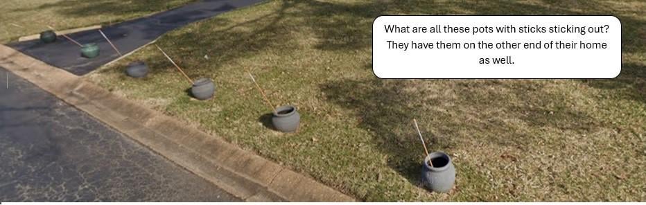 Does anyone know what these pots and sticks are for? Is this gardening related or something else? Neighbor has them on two ends of their home.