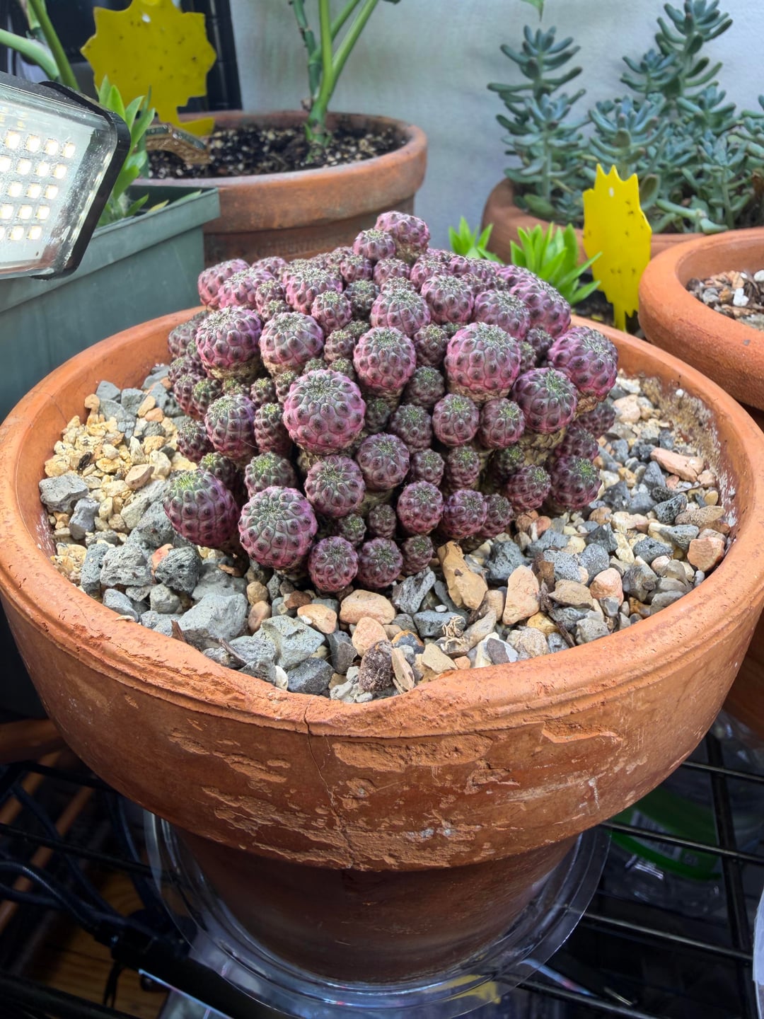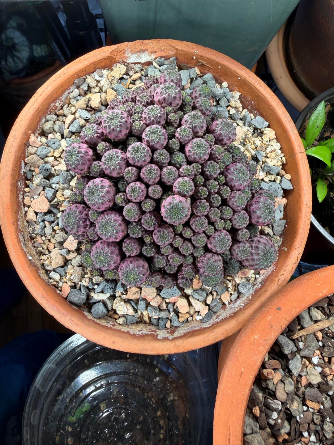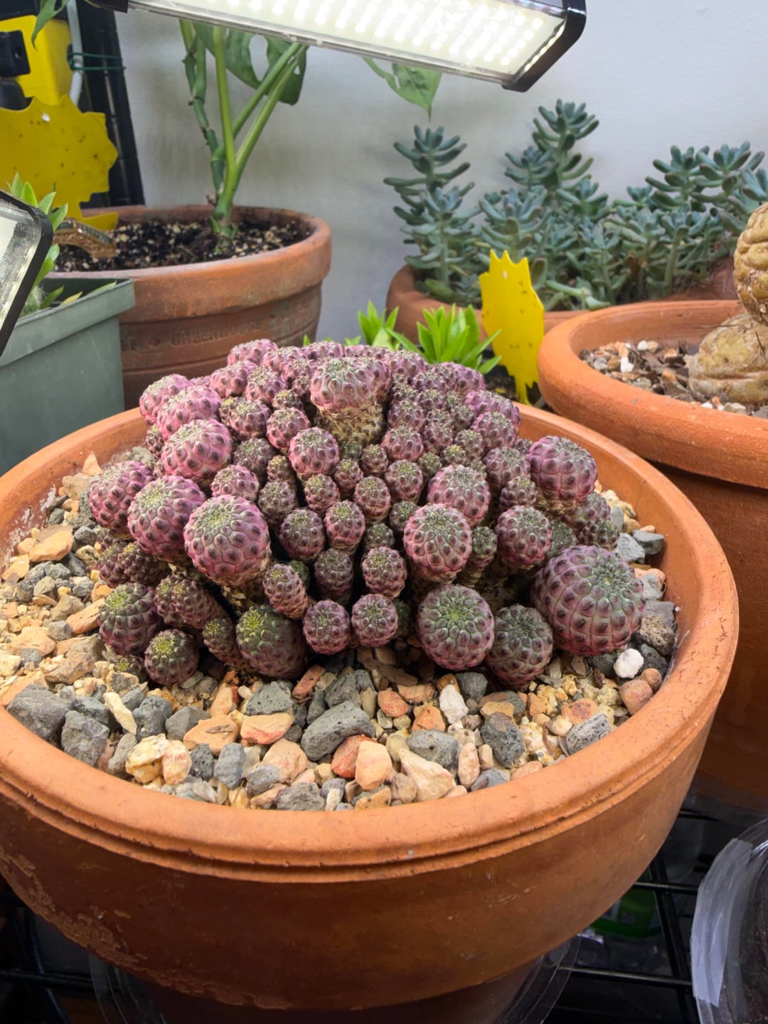 Purchased in ~2021 with ~5 growing tips. I think in cultivation it tends to produce more heads due to an excess of nutrients. It also self-shadows, especially around the edges, resulting in etiolation as the heads compete for light. I think I would need intense sun from all sides at all times to keep it compact and globose. It’s been in this pot for at least 3 years, and at the current growing rate, I hope it completely fills up the pot by 2027.