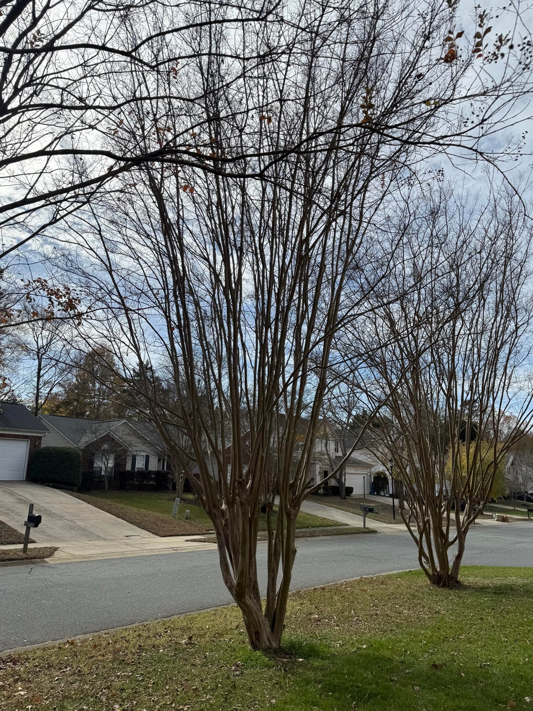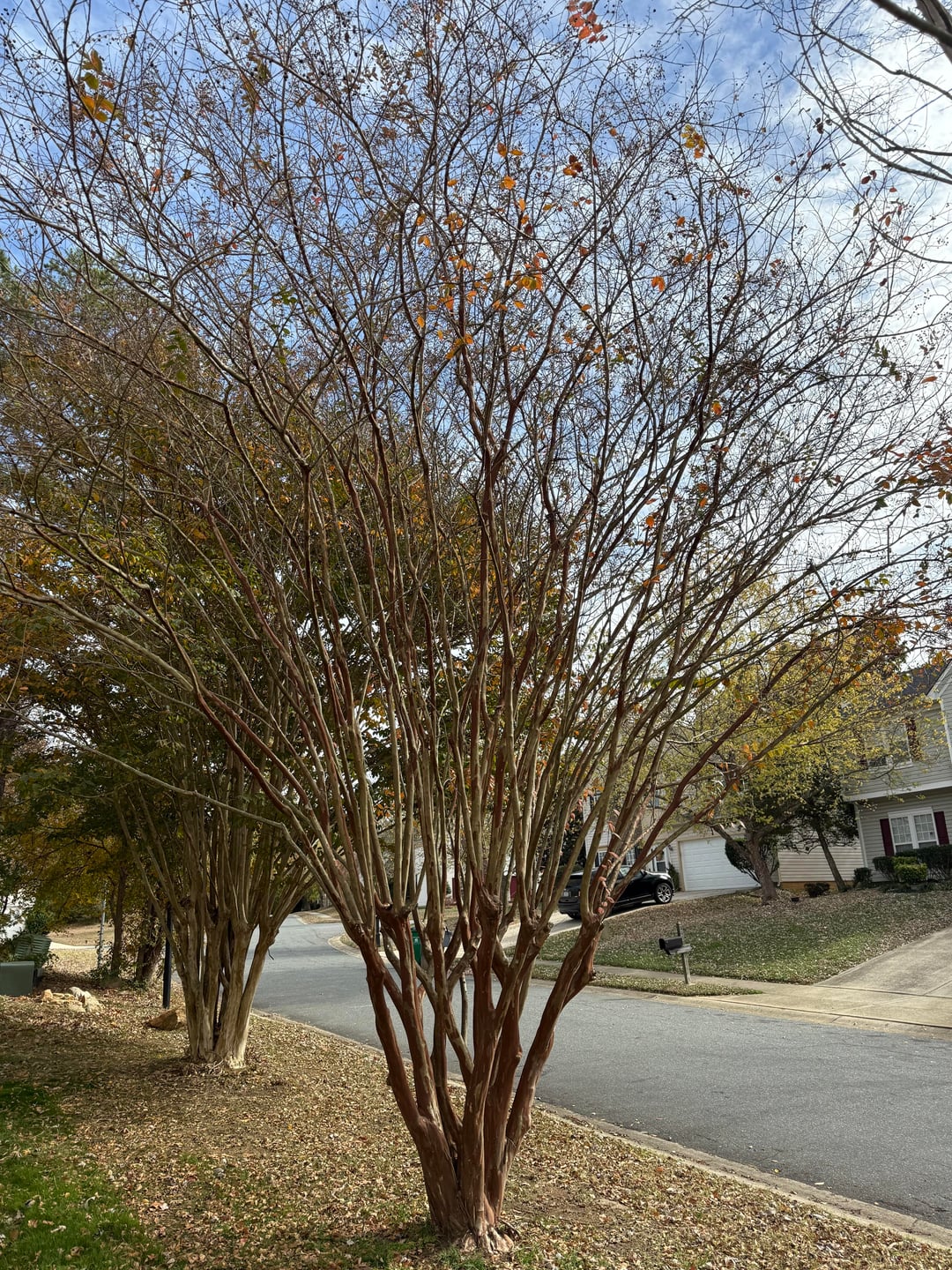If you cut this back, you’ll ruin it. Instead of having 8 or 9 branches reaching 15 feet tall, you’ll have 50 or 60 branches reaching 14 feet tall, as each cut you make sprouts 5 to 10 suckers. Google “crepe murder.”