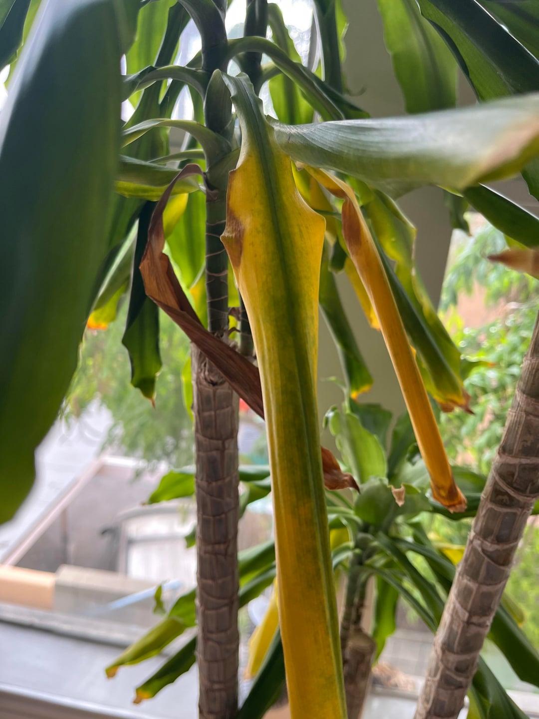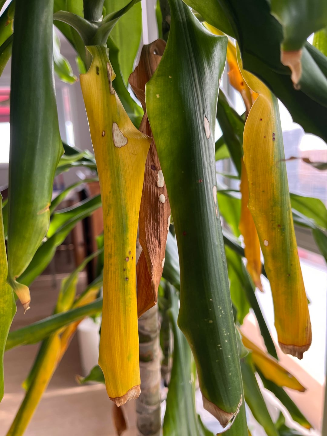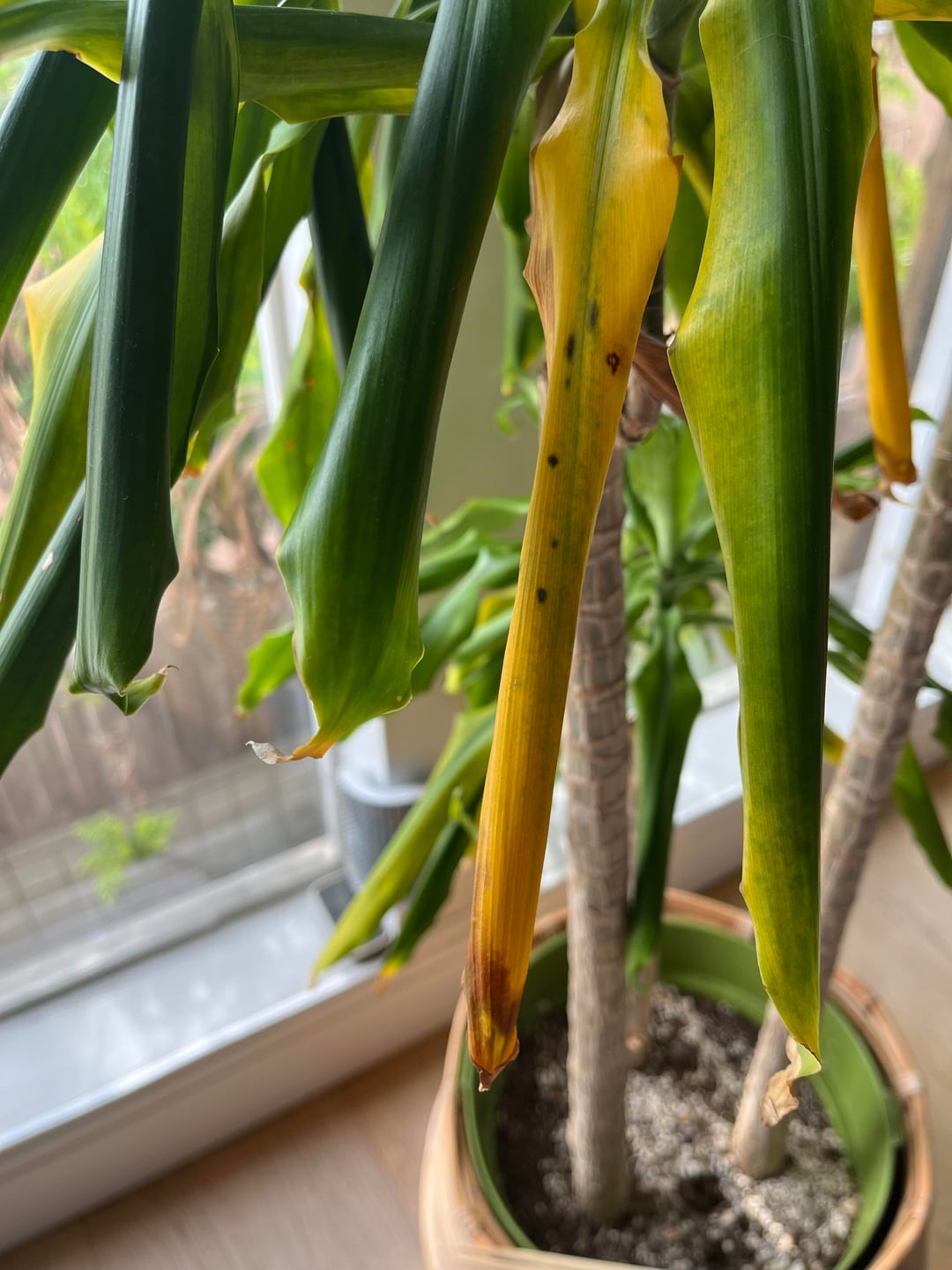Would also add that sometimes it’s cold next to windows/walls. My boss has her dracaena next to a brick wall at work and during the fall/winter the leaves turn yellow like yours I think mostly because the brick wall is the coldest side of the store 😅 there’s air vents and like no insulation I think 🤷🏽♀️ just saying lol