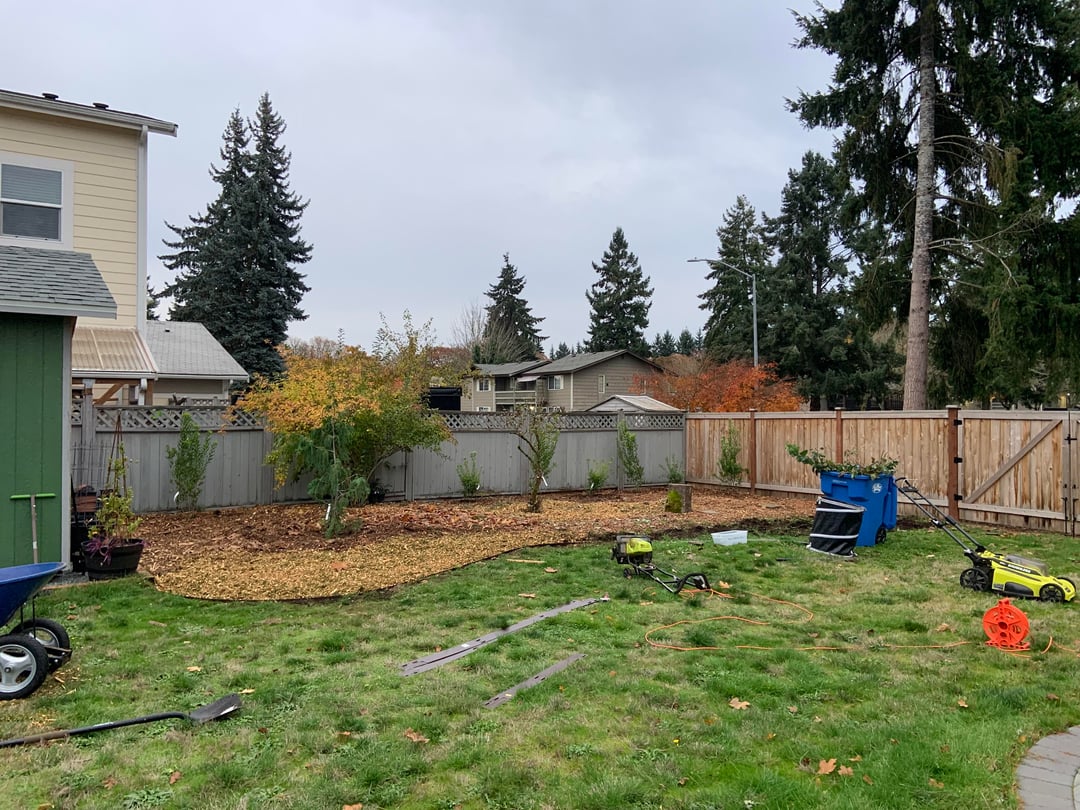 Currently in the process of rewilding most of our backyard with natives. We decided to start in this corner of our yard because we want some privacy from the neighbors (hence the Pacific Wax Myrtle along the fence). We also plan on planting a medium sized deciduous tree (Dogwood maybe?) near the stump towards the bottom of the first picture. All wood chips are from cedar and douglas fir that we got from some neighbors who had some trees taken down.