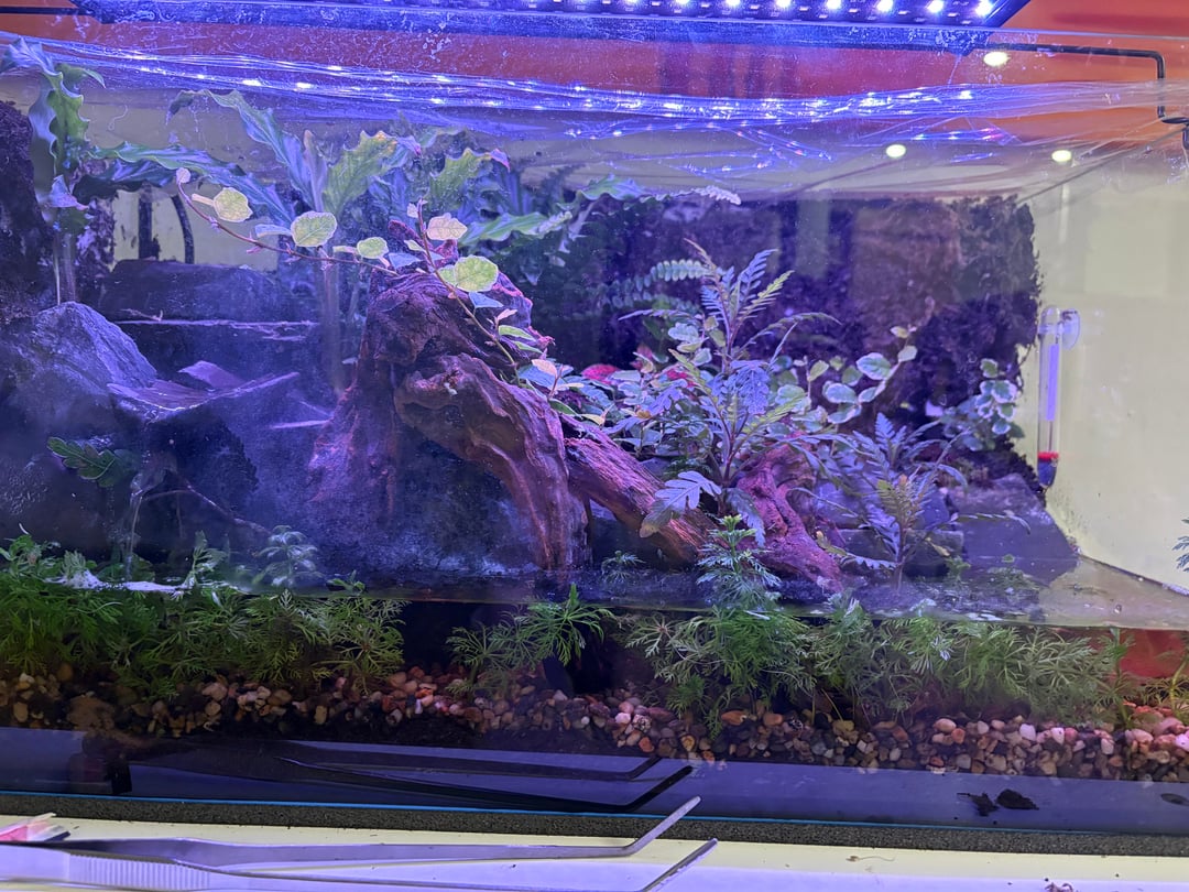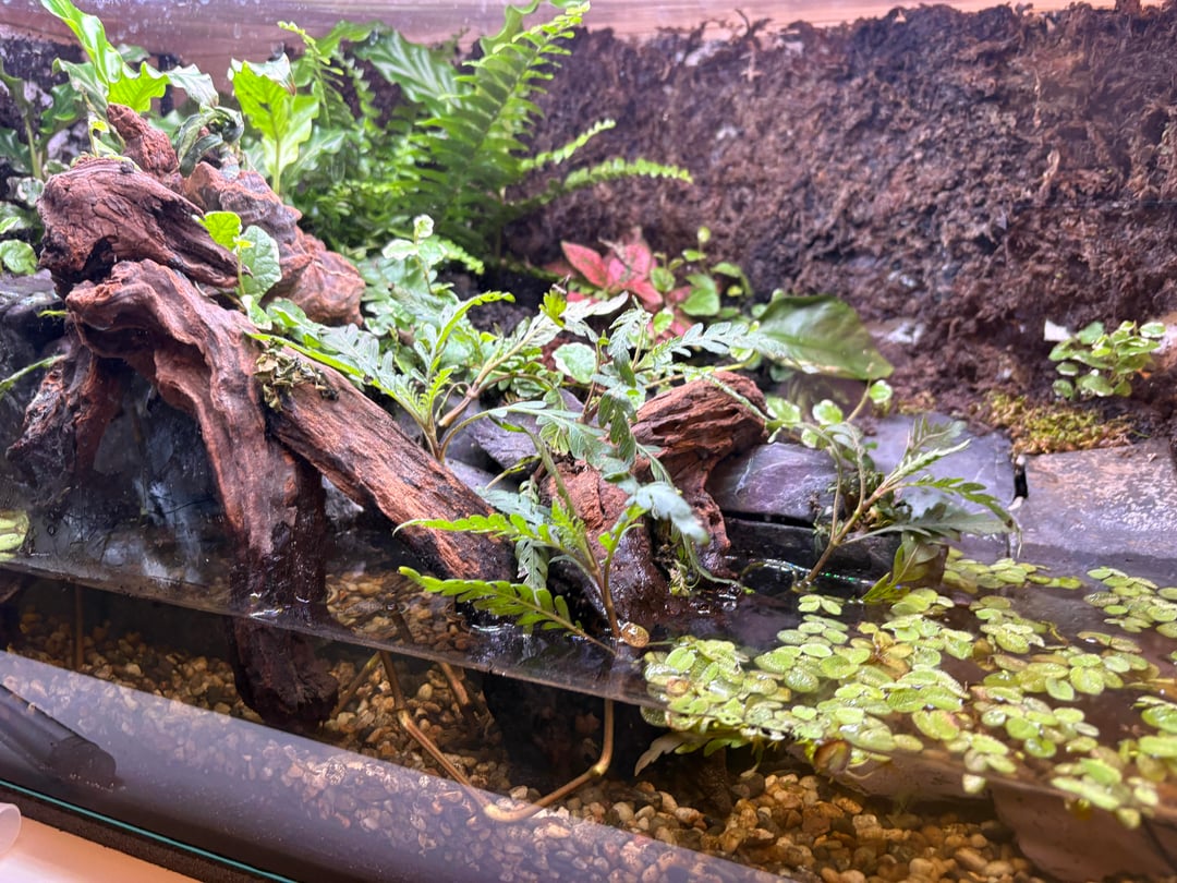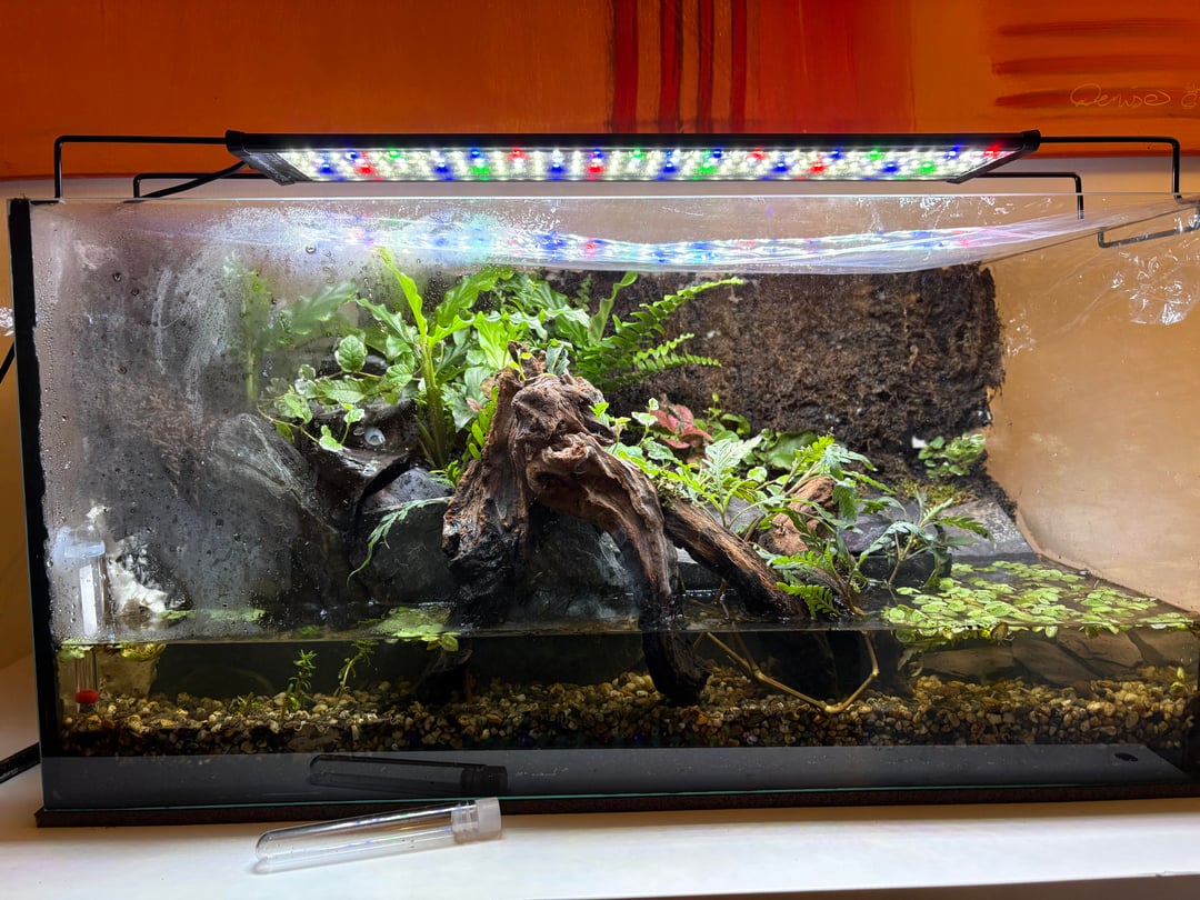 Hello, I have had this palladium set up for around a month now, hoping to soon at vampire crabs and some neocaridina shrimp and I cannot seem to keep the Ph stable and where I want it. I have recently tried adding an oak leaf but ph is still testing at 8.5+ when I want it 7.6-8.0, the tap water I use tests at around 7.5 and all substrate/hardscape should be inert as far as I can tell, any help would be appreciated!