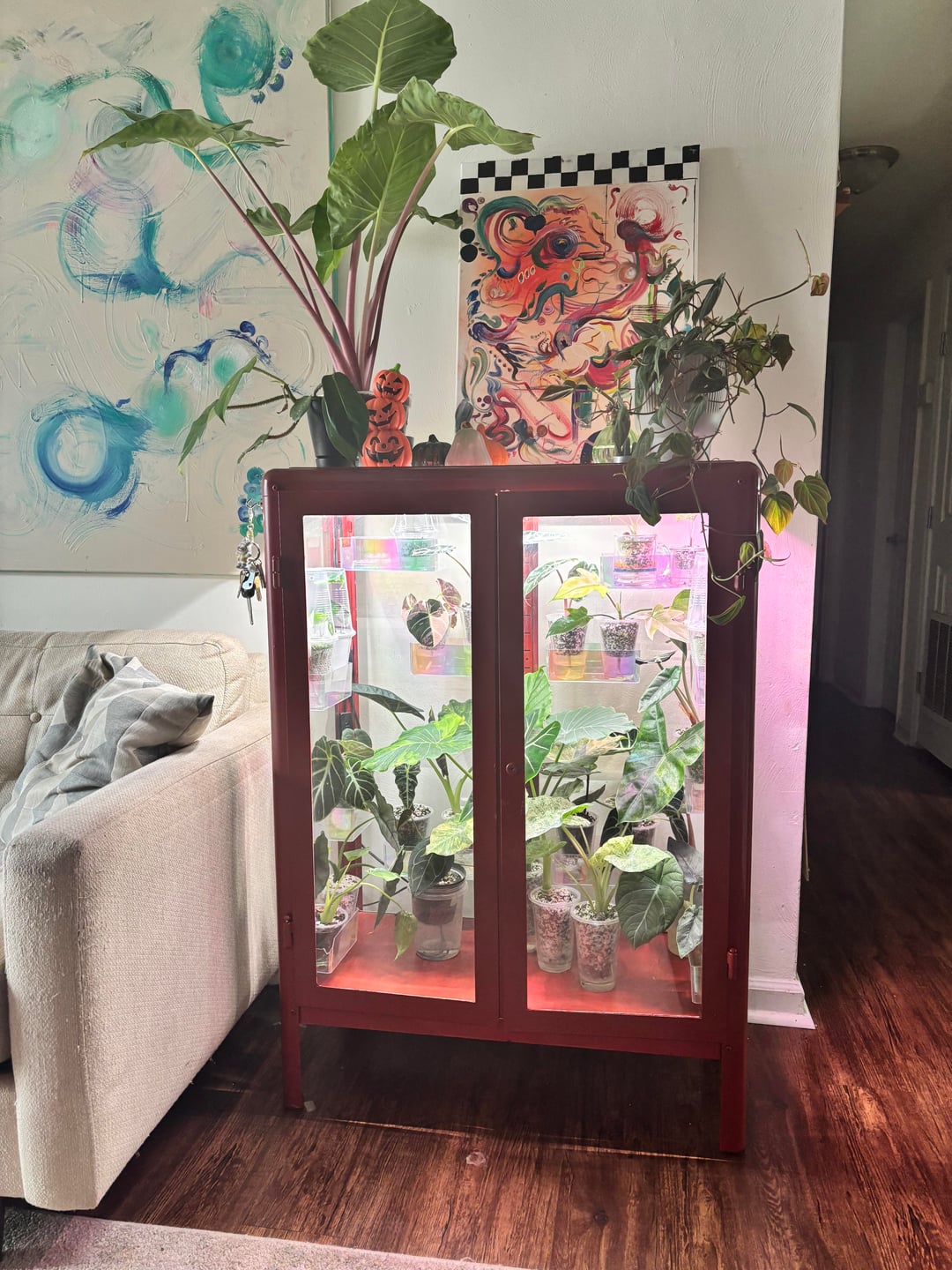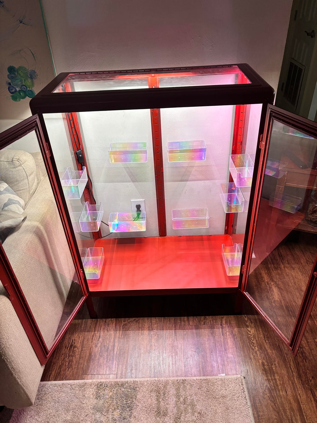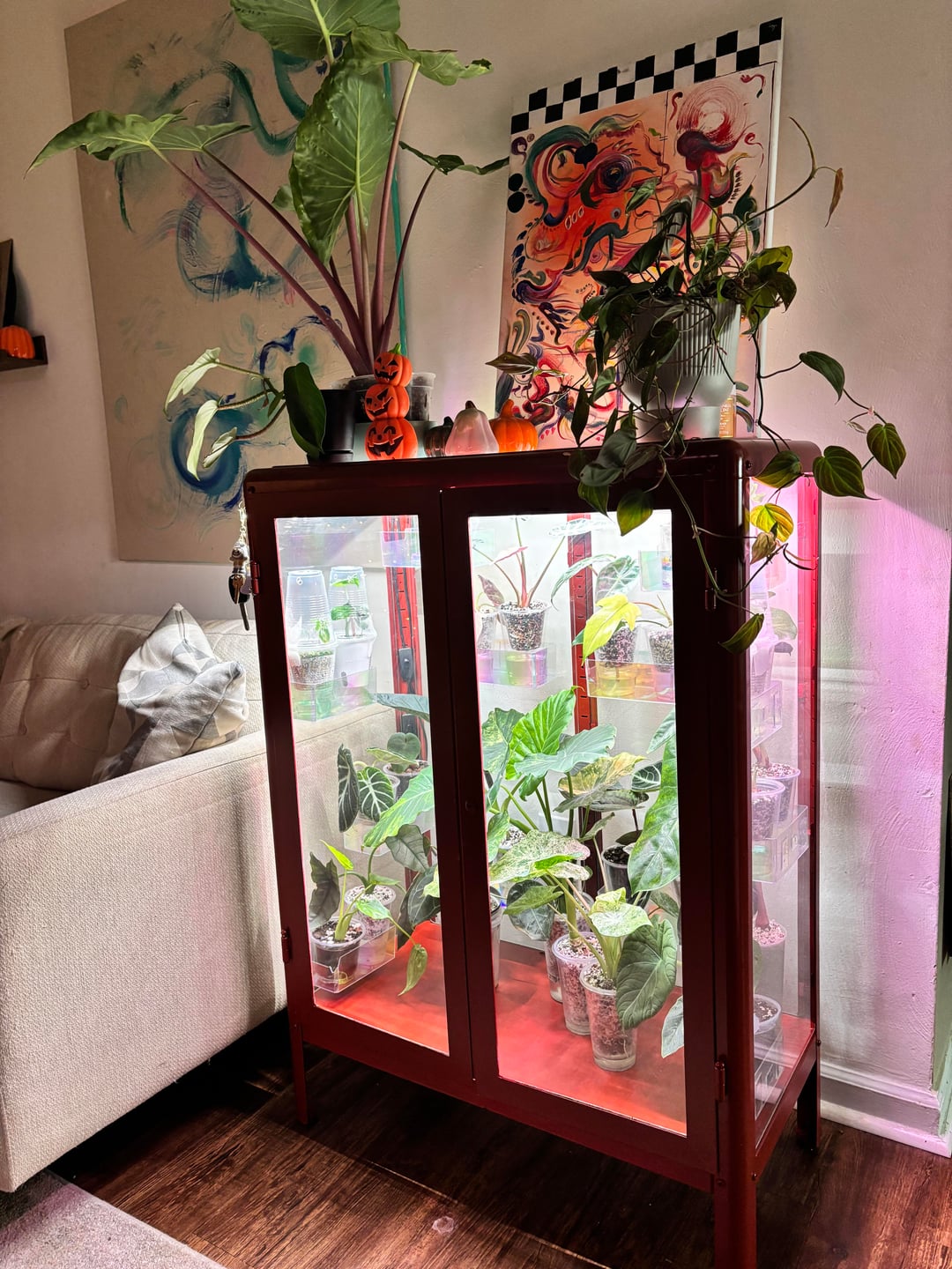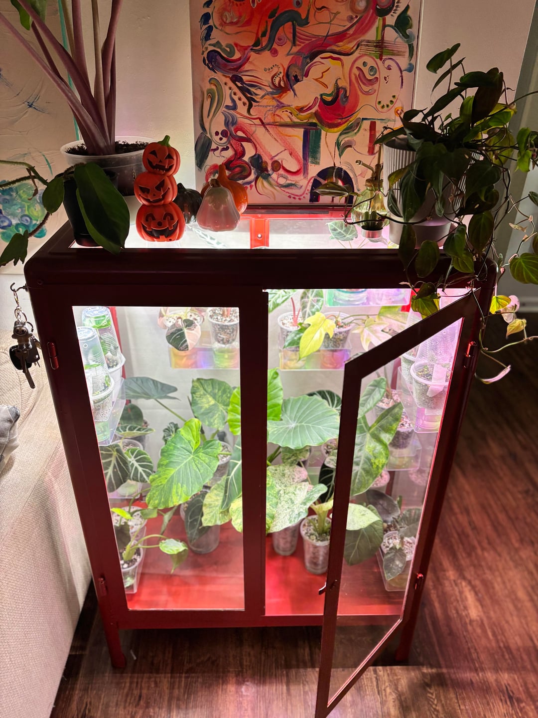 Cleaned the glass really well and reassembled the display stand. Used T Birrina 1 ft grow lights- White (4) at the top (the lights are magnetic so they just pop up there since the Fabrikör frame is metal) and wired the cords through a back glass panel by opening the brackets and pushing the cords out of the back then closed the metal brackets around the glass to keep everything in place. I did not drill a single thing on this entire project. I used Alien tape I got from Lowes to stick dollar tree acrylic shelves onto the glass. It’s a thick and almost starburst consistency tape that’s sticky on both sides. Virtually clear and seamless on glass. It’s the best tape ever and holds a lot of weight. And stuck my shelving up with multiple cuts of the tape to ensure weight distribution at different specific places to ensure each plant has decent room to spread out.