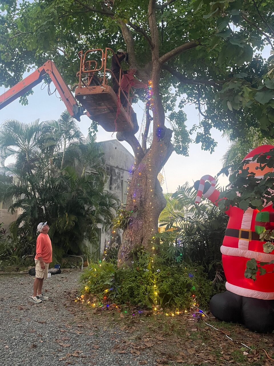 Hanging lights from a lift, Santa’s elves place beautiful lights high on a tree. (Photo submitted by Sarah Brady)