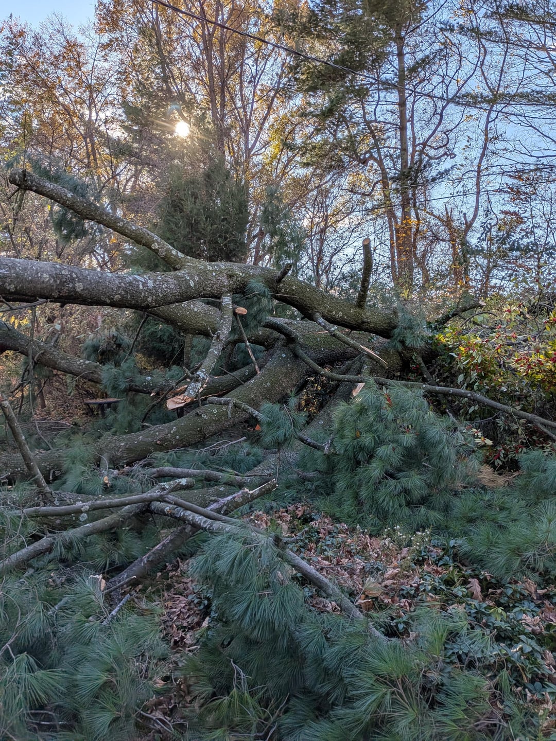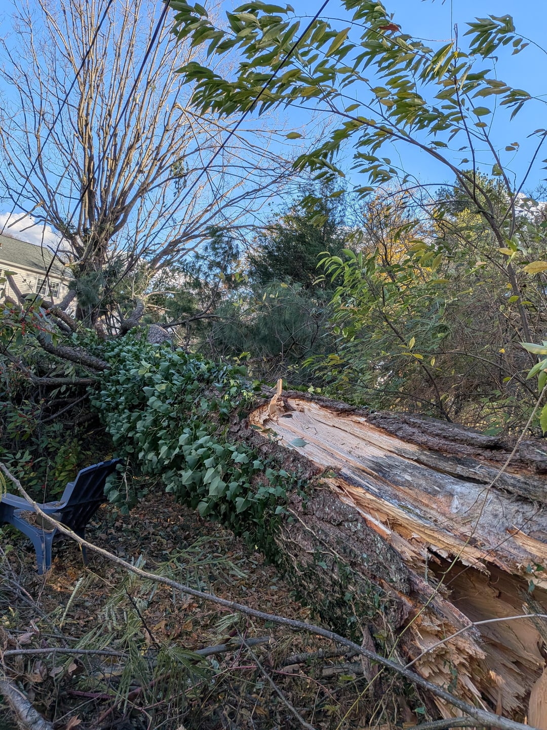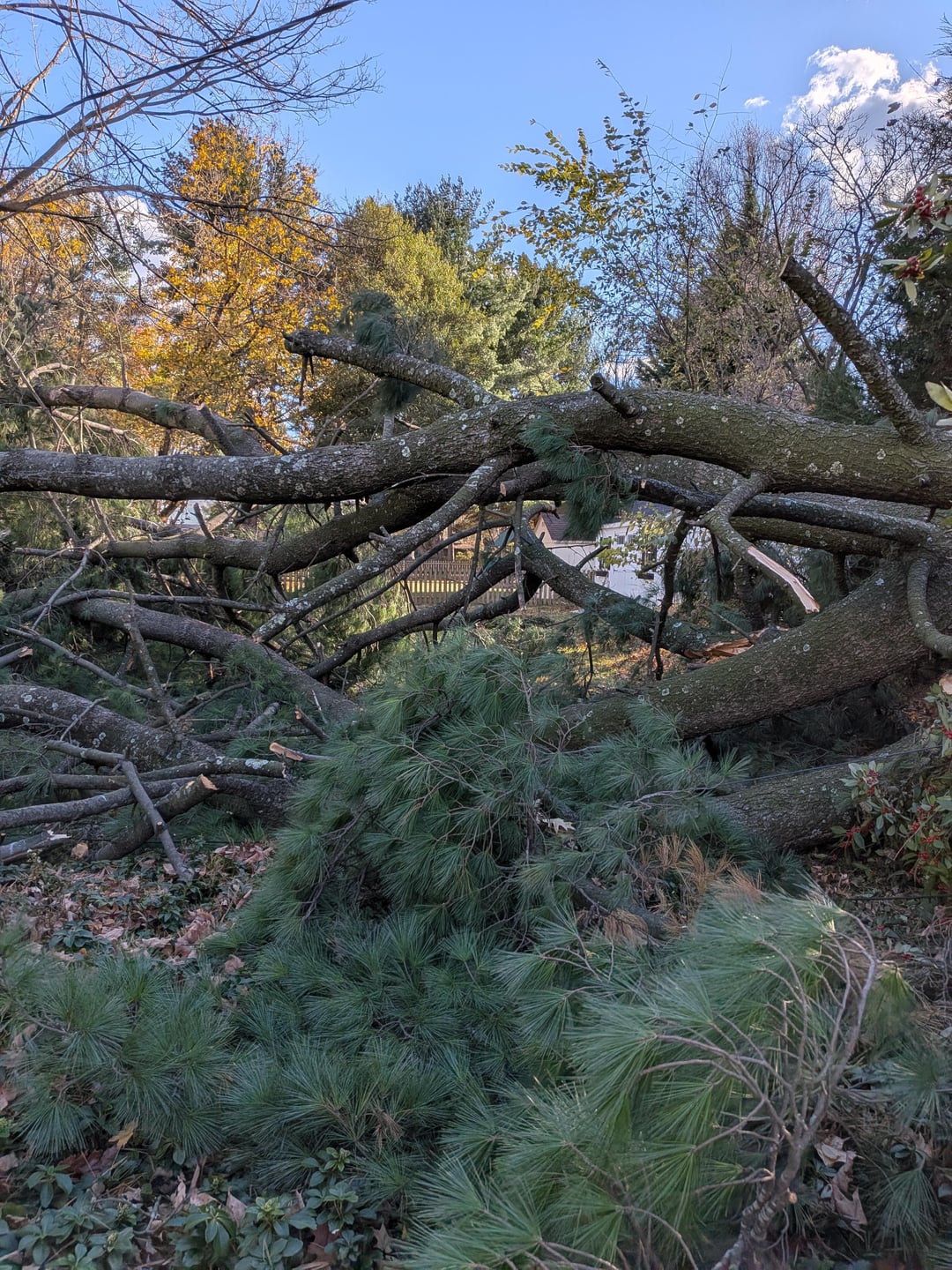 This pine tree was at least 50' and it snapped near the base in heavy wind yesterday. I always thought it was healthy until this and now I see it has a grayish patch on the bark and some black beneath the bark. I am curious what this is and if it could have caused the weak ess that allowed the tree to snap. It fell on a mature Sugar Maple and some other smaller woody plants. We will hire an arborist and a tree service. Insight and advice are needed. Location Central Maryland