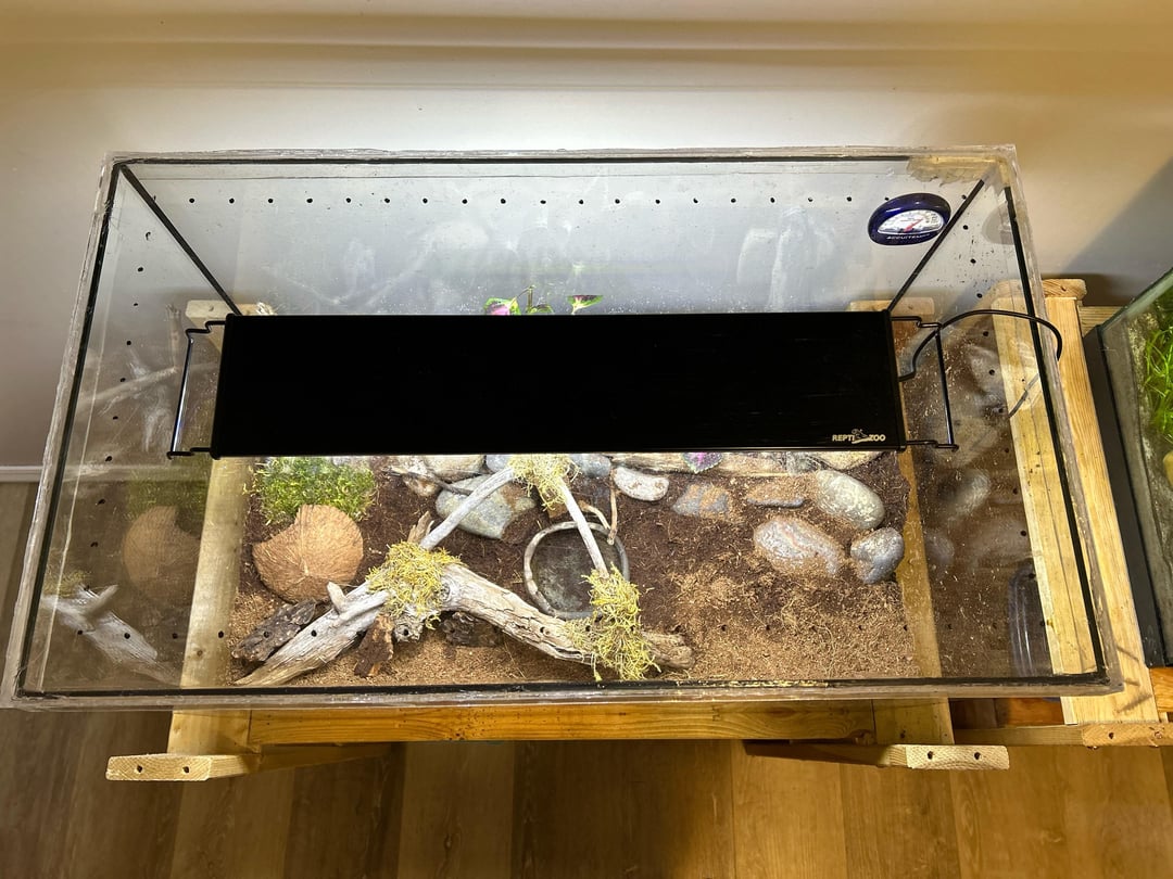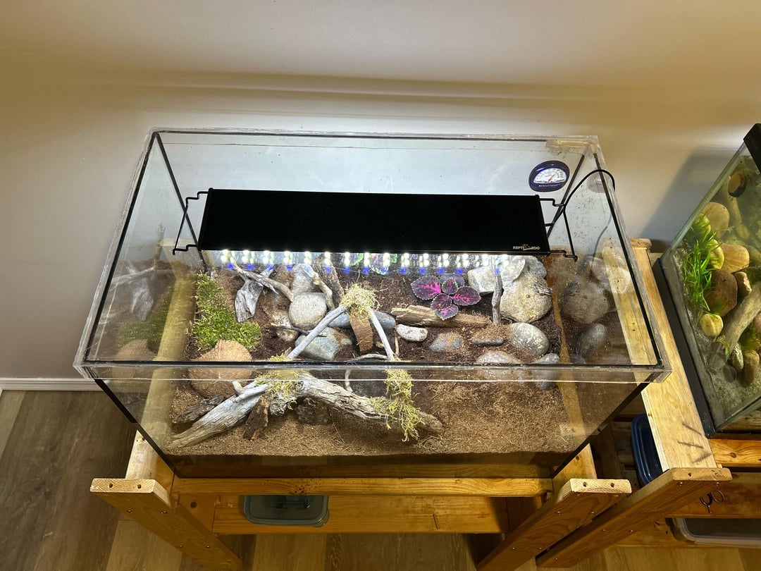I’ve recently begun putting some free time into my sad little pacific chorus frogs tank, he’s lived in it for almost a year now and it hasn’t changed much in that time. The tank is rather large (23 3/4 long, 13 1/2 wide 15 1/2 deep) for just him and I’ve had a very hard time trying to keep plants alive in it due to the fact that the lid I made for it ages ago is just wood with some window mesh for ventilation so humidity drops fast and consistently gets bone dry between misting.