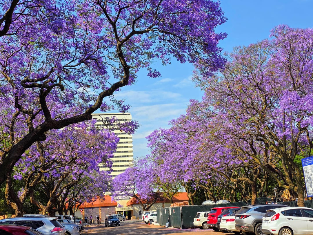 Jacaranda mimosifolia is a sub-tropical tree 🌴 native to south-central South America that has been widely planted elsewhere because of its attractive and long-lasting violet-colored flowers 🌻🌹. While here in South Africa it is an "invasive species" but it has special status and in Pretoria you find very old trees. We do love the purple all over Pretoria and Johannesburg from Spring 🌱 to early summer 🌞. These pics are from the University of Pretoria campus!