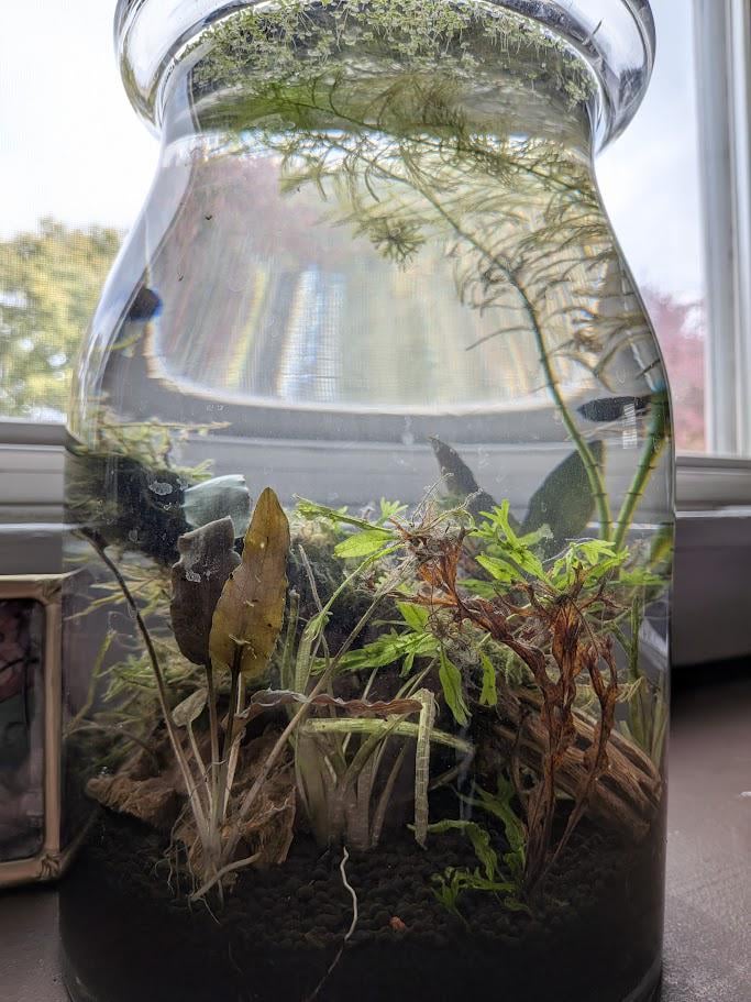 This was day two, my 2.75 gallon jar is about 5 weeks old now. Some plants have had some melt, more have exploded in growth, and it brings me a lot of joy. It has a hitchhiking bladder snail and two nerites, and so many copepods. I saw a planaria last week so once it's trapped I'll start my hunt for some neocaridina.