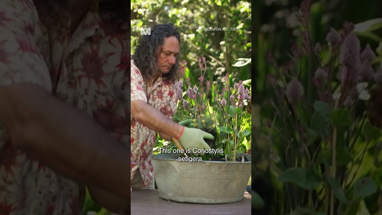 I’m going to create a wildflower combo. Start by selecting a suitable pot. Now, it should be at least 50 cm wide. This old tub is a great match for this bushland setting, and the rusted out bottom will provide added drainage. You’ll also need a native potting mix. And as desert wild flowers love sandy soil, I’m adding horicultural sand to the mix. Perlite or vermiculite will work just as well. I generally use a 50/50 mix. And now to the wild flowers themselves. This is malamala. It’s a native perennial. It produces absolutely stunning blooms. This variety is called Totus Matilda. This pink kangaroo paw called pearl is super short with branching stems. This one is conno stylus seta lemon lights and it loves dry summers and a sunny spot. This is brackantha bchiata the paper daisy. Flowers best in a sunny spot and it loves good drainage. This brackoscone hybrid is magenta bliss. Its fine foliage is versatile and adaptable, and it flowers most of the year. Once you’ve planted out your pot, place it in full sun somewhere front and center where you can admire the blooms and water in well.