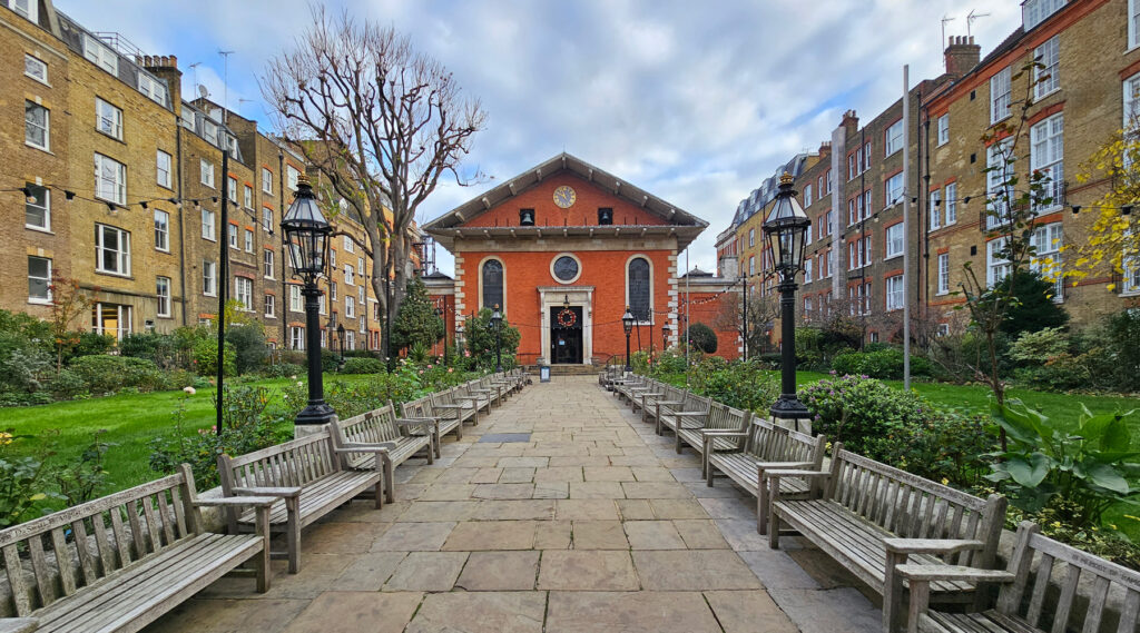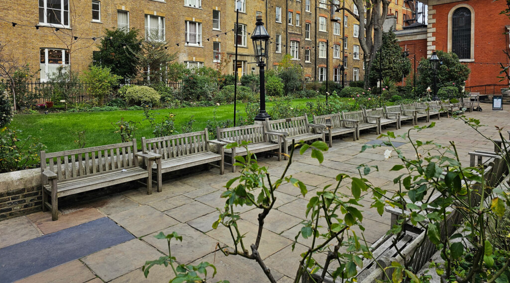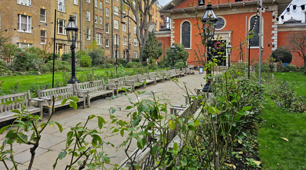 Next to Covent Garden is another garden, a rather greener pocket park next to St Paul’s Church, lined with a large number of park benches.