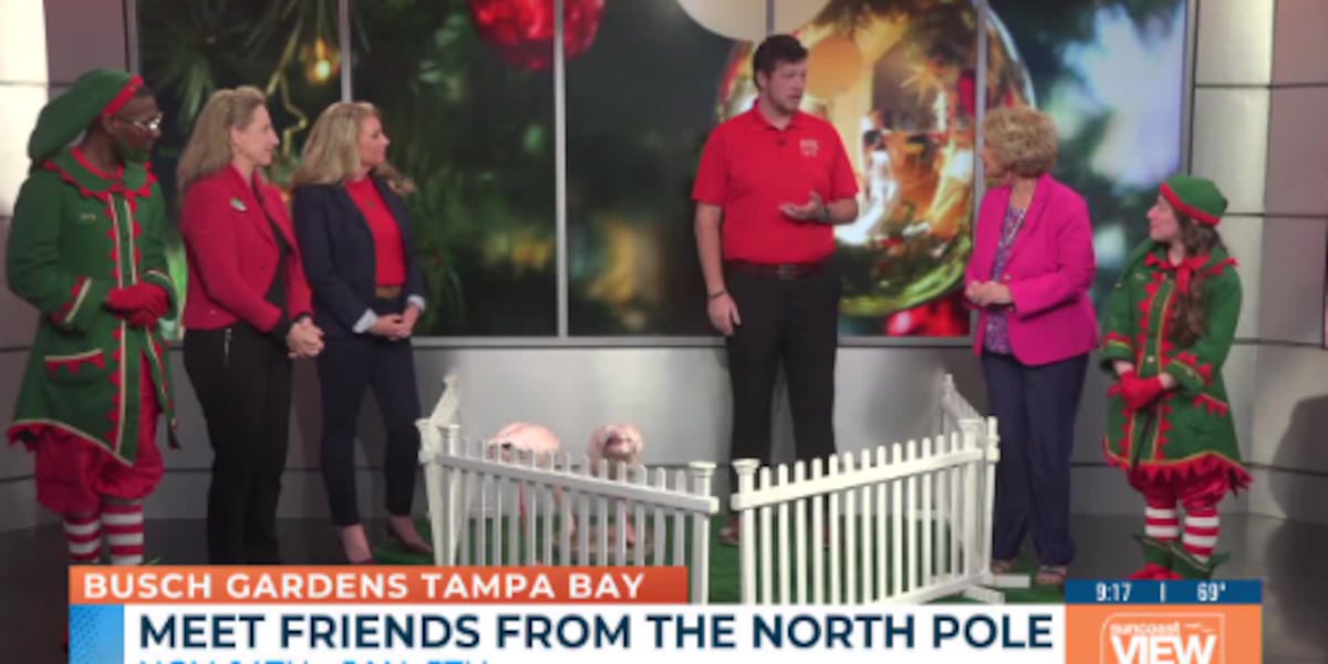 Kristine Morgan, vice president of entertainment at Busch Gardens Tampa Bay, joined us to promote the event alongside 2 pink flamingo friends, Santa’s elves, and a zookeeper.