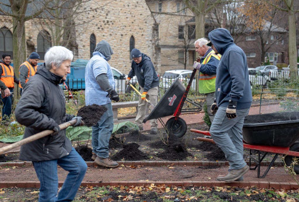 “We are putting the roses to bed for the winter,” explained Stephen Walker, Evanston public works supervisor at the Merrick Rose Garden. About 20 city workers, landscapers from the Chalet nursery and volunteers started their effort at the 77-year-old garden at the corner of Lake Street and Oak Avenue on Tuesday. Their first mission was to cover the base of the garden’s roses with leaf mulch to keep the root systems warm. First blooms should be in late May.
