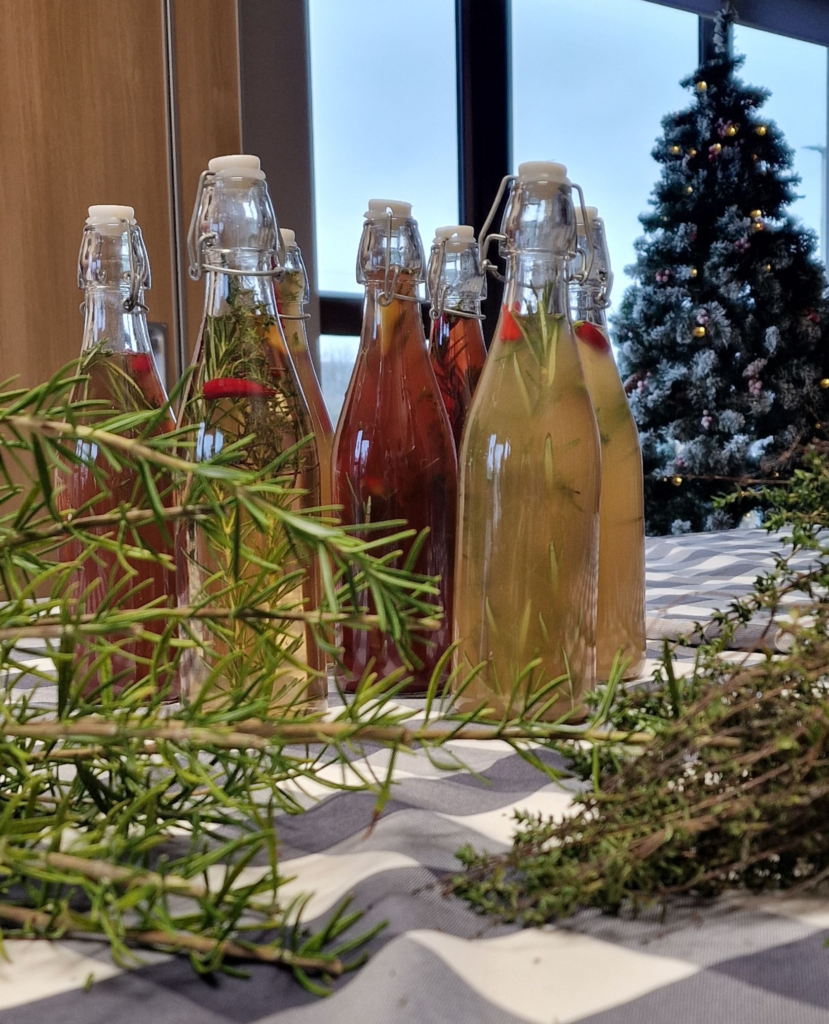 “Sterilise your bottles and work with herbs like sage, thyme and rosemary. Just put a few sprigs into the vinegar, you don’t have to overdo it. A hand-length sprig of rosemary in a bottle would create an attractive central feature and you could add some spices, maybe a few peppercorns or fennel seeds.”