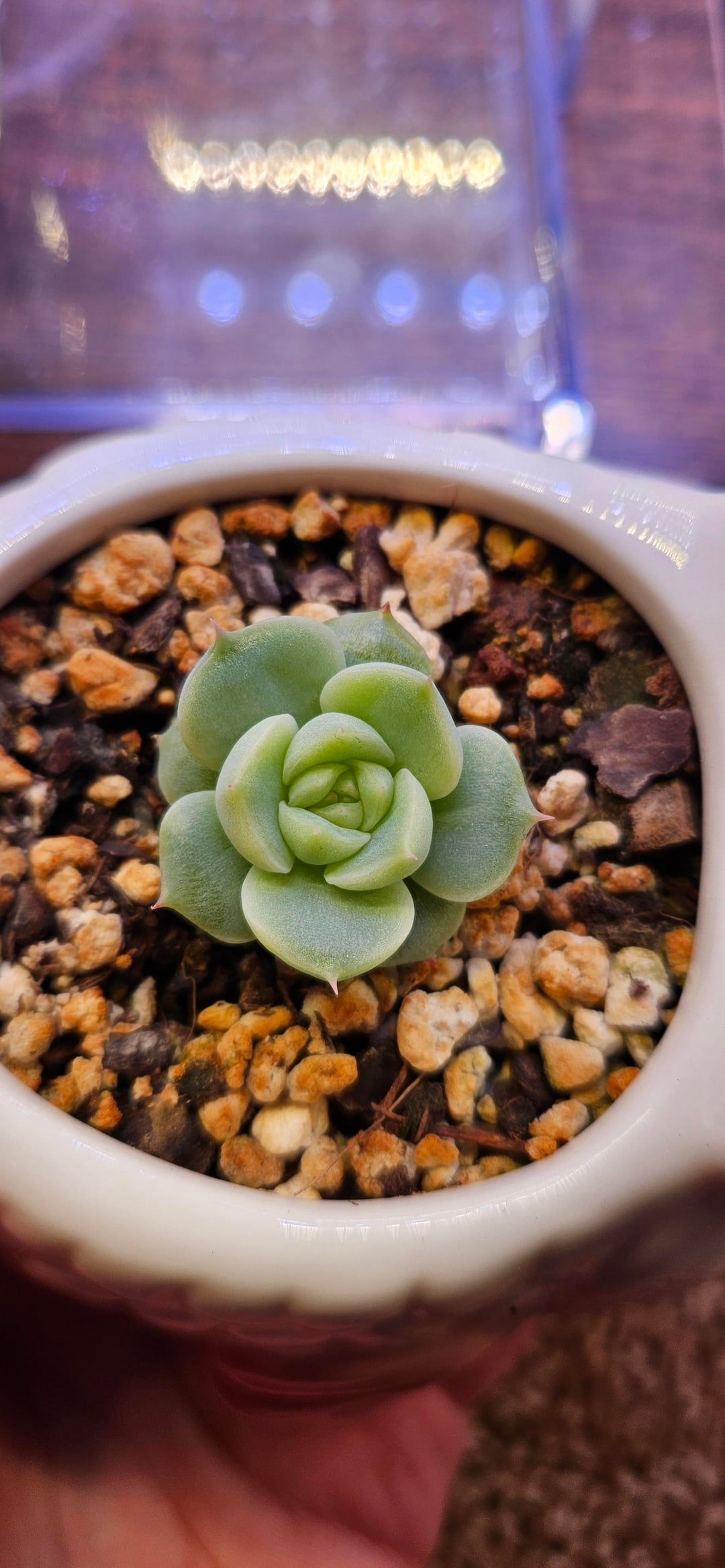 This was a leaf prop and I can't for the life of me remember what it came from..could be from my collection or a random prop lift. It gets about 2200 fcs for 12 hours every day and still hasn't really developed any stress coloring. I have one that was sold to me as a PQ and the leaves aren't quite the same shape but it also hasn't developed stress coloring despite getting ample light so that's why I was leaning PQ. What do we think? I was super hopeful it was a Blue Peacock but I think that can be ruled out.