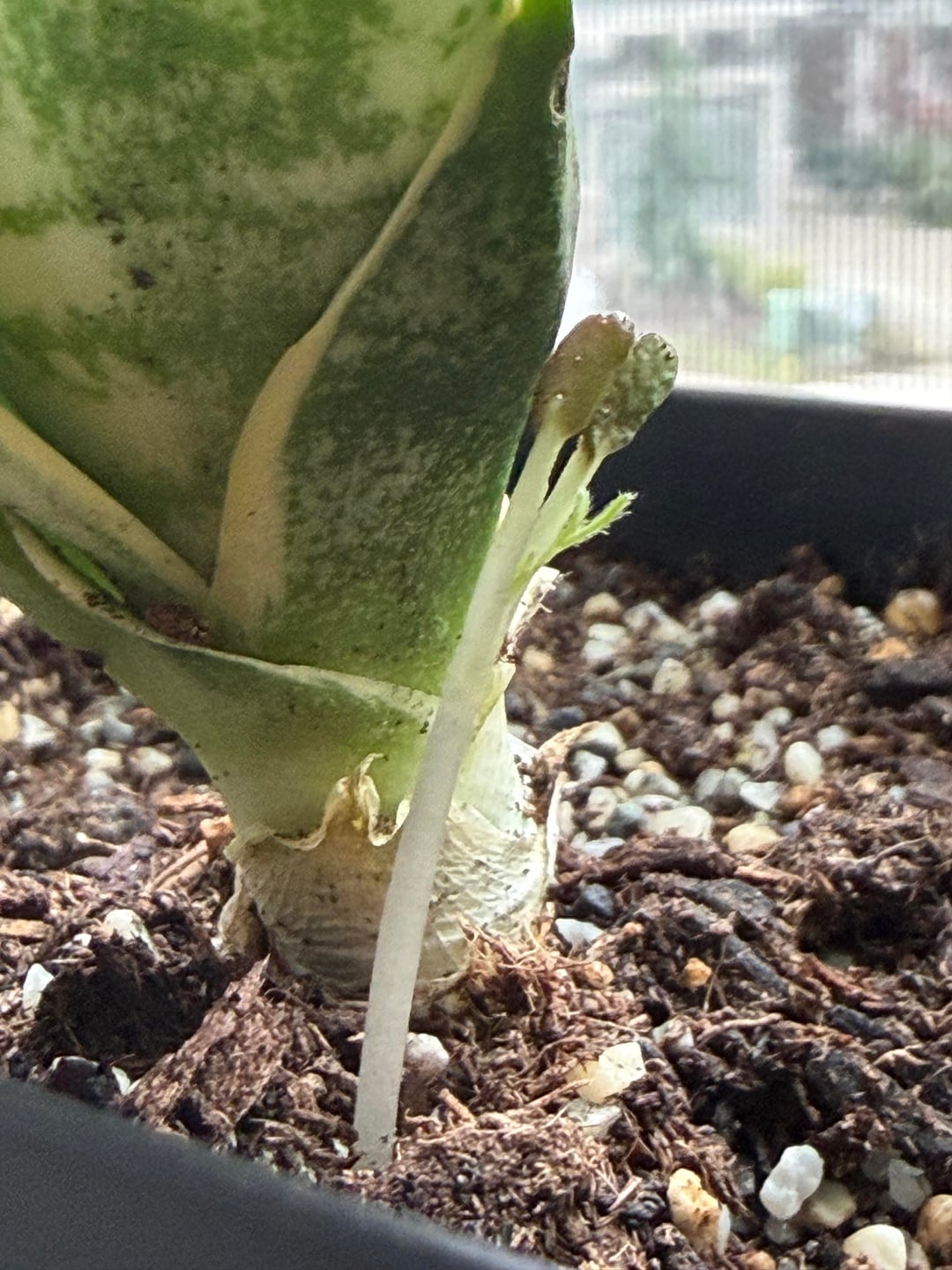 I separated this snake plant pup (and three others) from a mother plant 2 weeks back. This pup is barely 3 inches tall and did not have roots when I separated it to repot. Few days later I saw this growth next to it and I am wondering what it is. I imagine this pup is too small and young to be producing offspring or flowers of its own, right?
