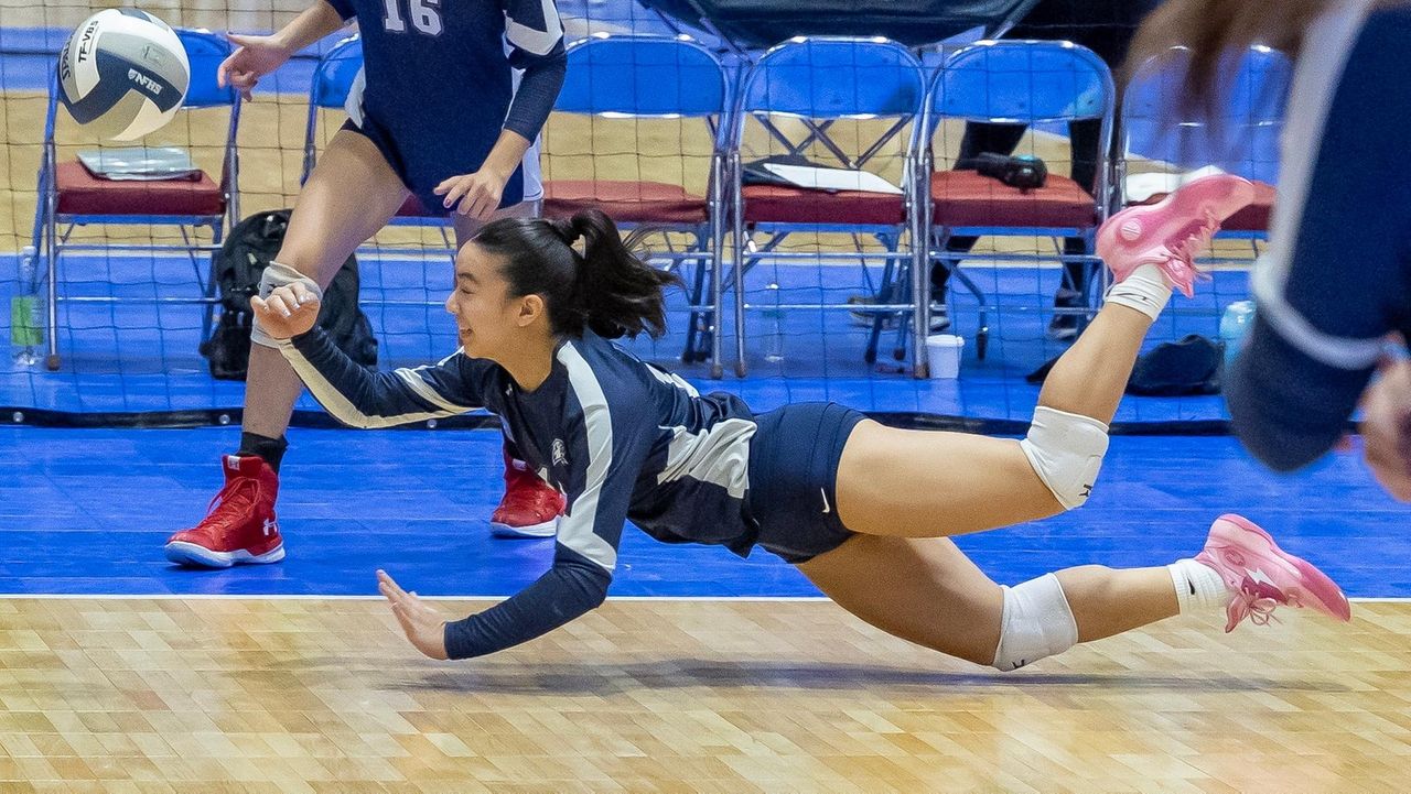 Jayden Tan of Plainview-Old Bethpage JFK dives for the ball against Lancaster in pool play of the state girls volleyball championships in Glens Falls on Saturday.