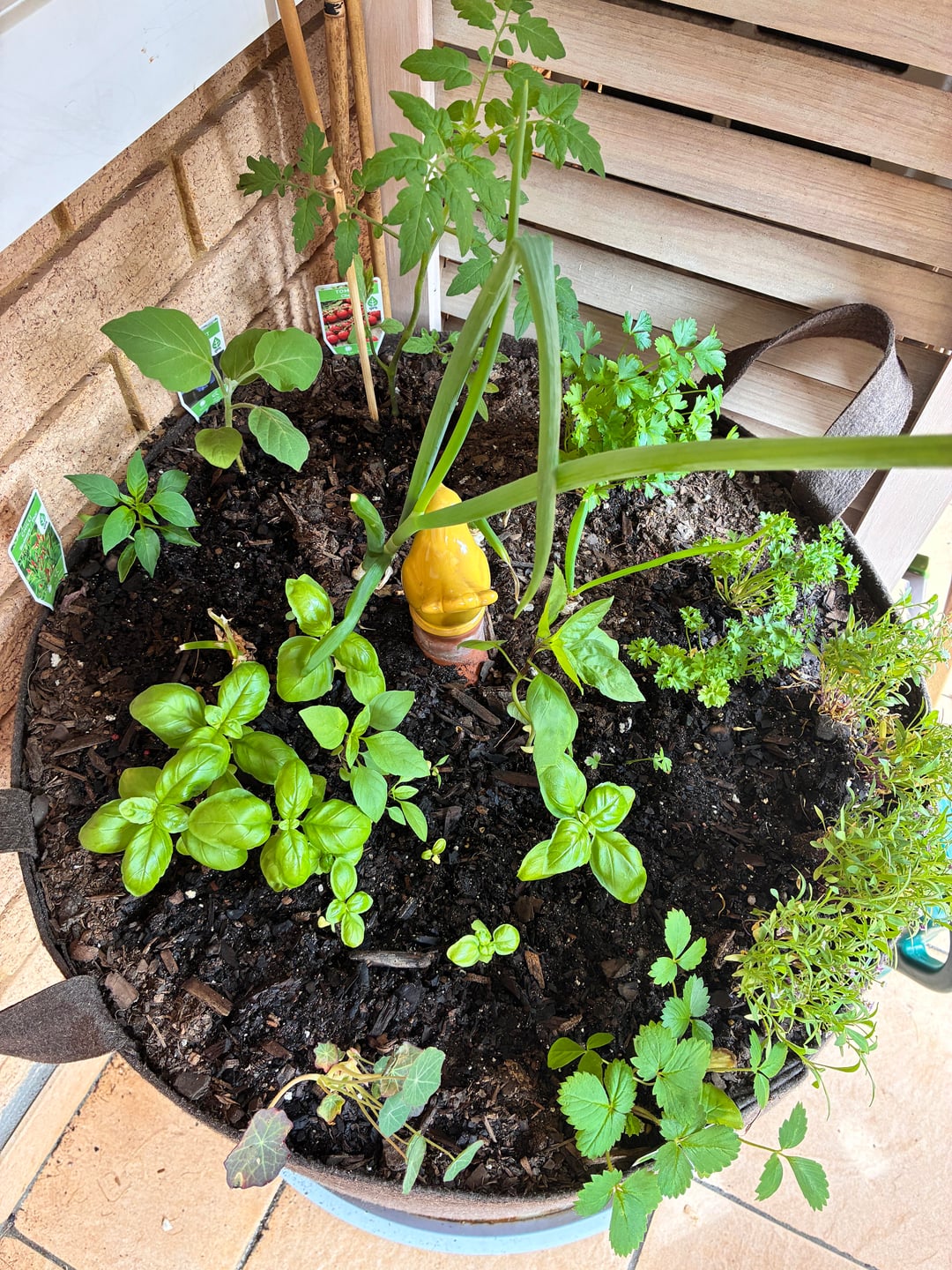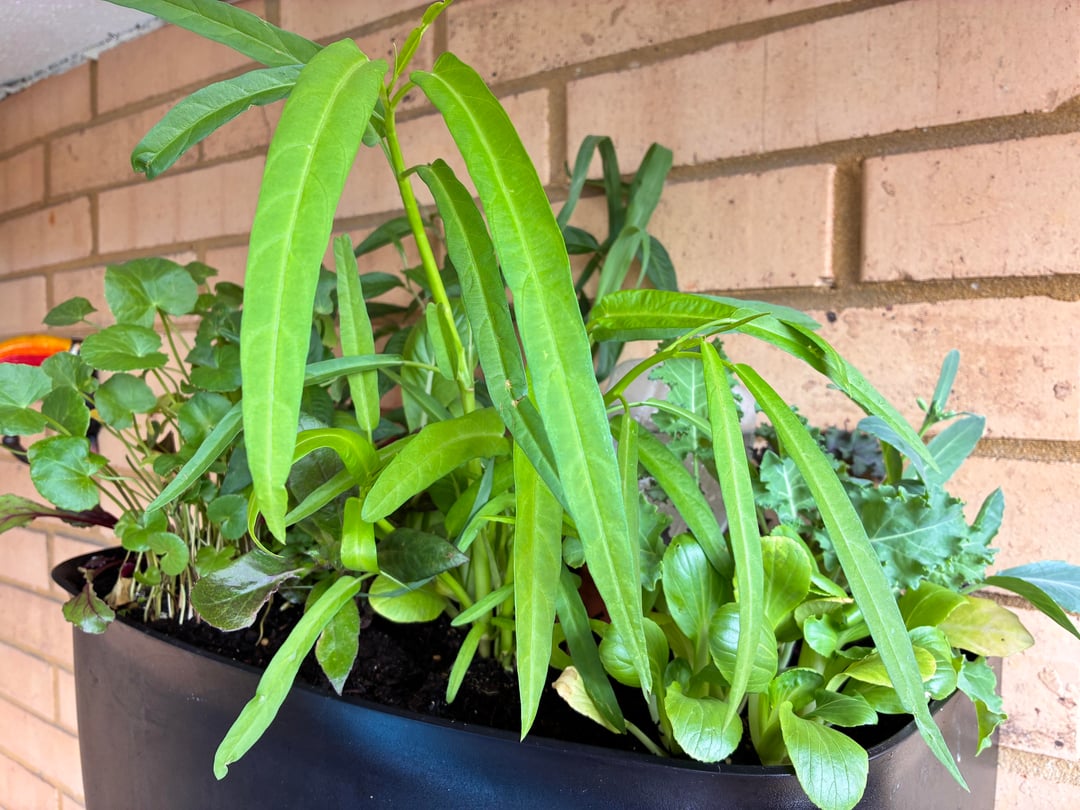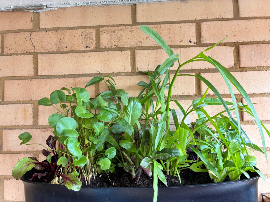 First harvest includes native pepper berry, native thyme, Vietnamese mint, kang kong (water spinach), bok choy, Choy Sum, basil, creeping thyme, and parsley.