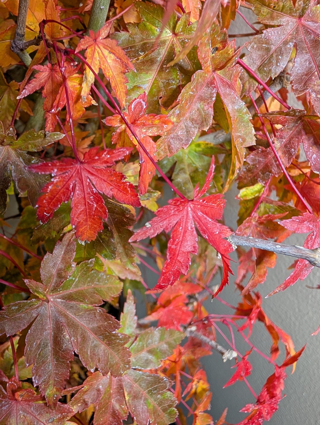 Had some colder temps this last week and this big Japanese maple has finally turned. The outer leaves have a nice deep red, but the layer underneath has soft yellows and oranges, and under that is a layer that still has green. It's quite lovely.