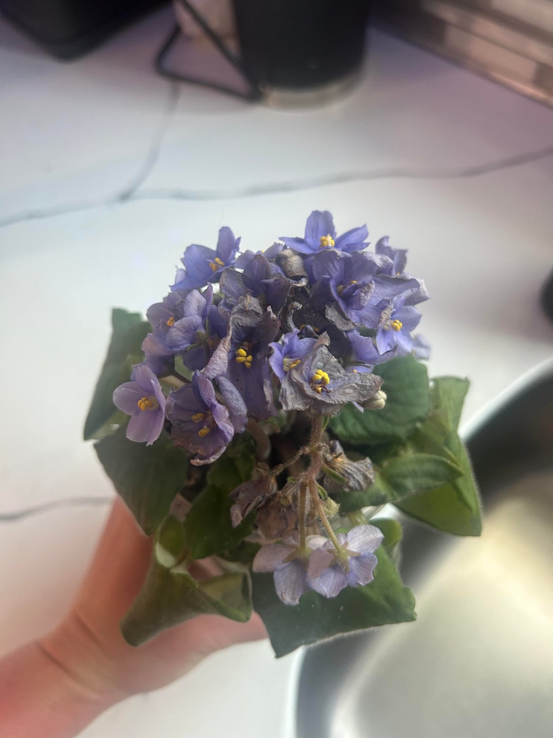 I have her in a self watering pot in an east facing window. I add a little fertilizer to the water reservoir. Anything I could be doing better? Some of the blooms look a little sad by Strange_Afterno0n african violets 1 Comment Mick_toys 2 days ago If the soil is wet and it hasn’t drink anything is root rot for sure. You need to check the root ball and get rid of the rotten parts