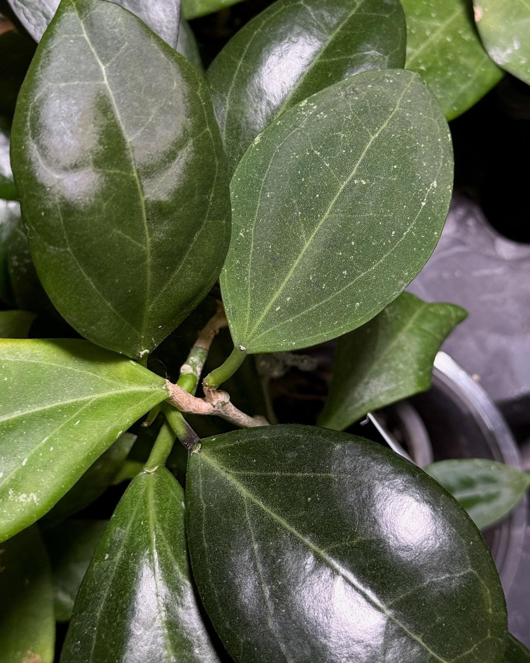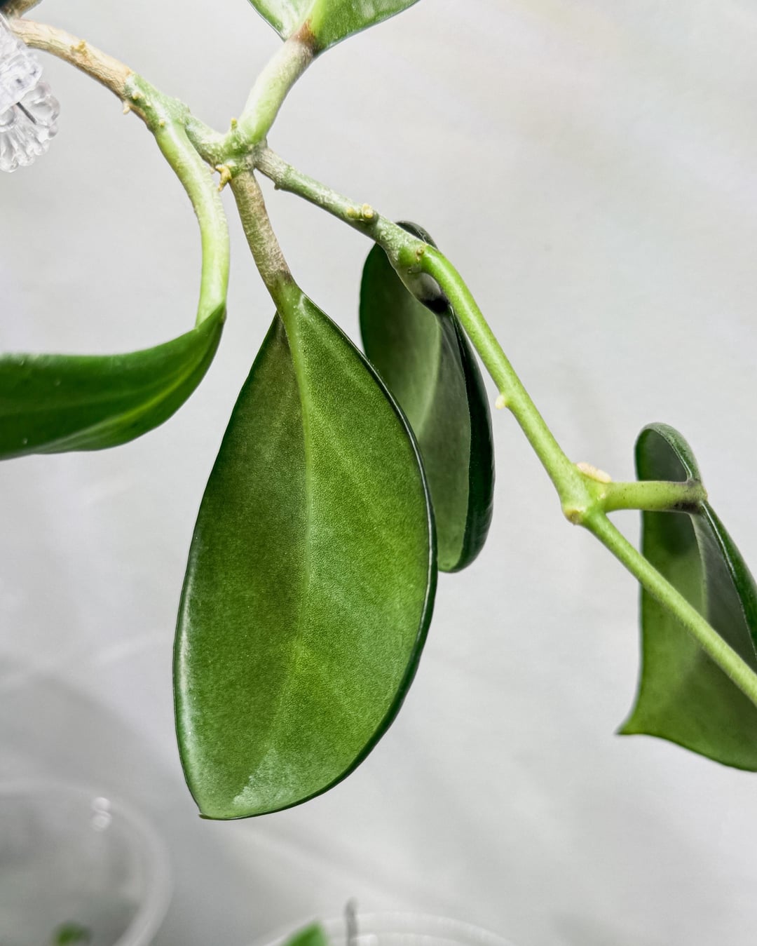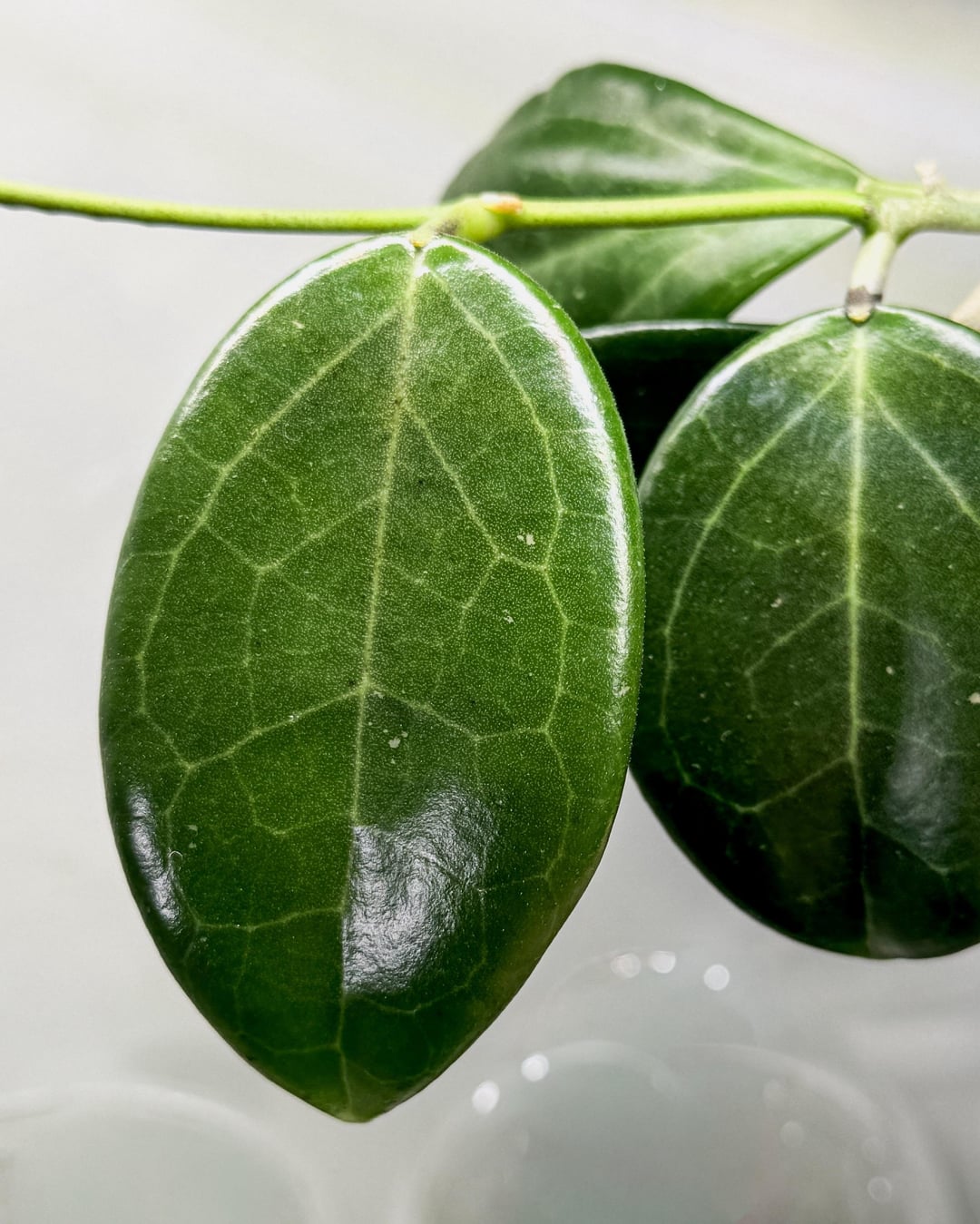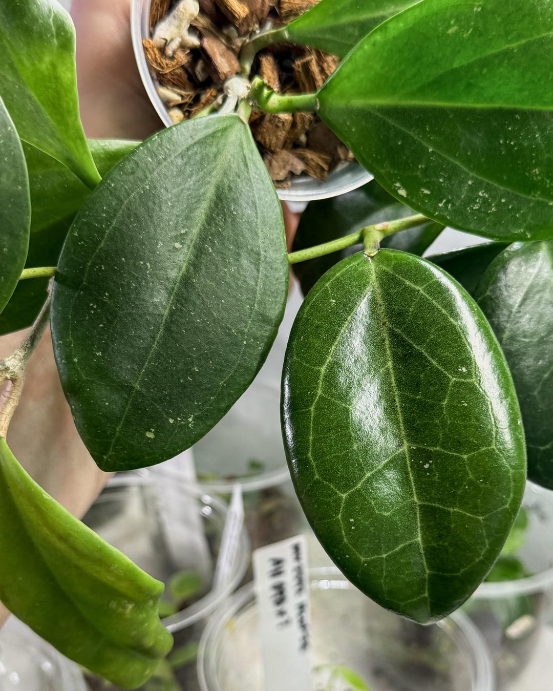 Two seedlings of an open pollinated H. subquintuplinervis: HLW-2421-A & HLW-2421-B. They both were down to a single leaf last spring (due to mites mostly) and the new growth was devoured by thrips after that. We’re back in business now and these new leaves are amazing. HLW-2421-A (pic 1) is glabrous and firm yet rather thin with a lacy net of veins plus a prominent recurved margin that curls back into a lip (pic 2). It makes it look thick from the front but it’s concave on the back. Its sibling HLW-2421-B (pic 3 on the left) is more matte and sometimes pillowy with more splash but with less striking venation. It’s also even thinner which is surprising given its known parentage. They’re both still small and settling into their mature traits, so there’s potential yet! Also can’t wait to see what the flowers look like 💚
