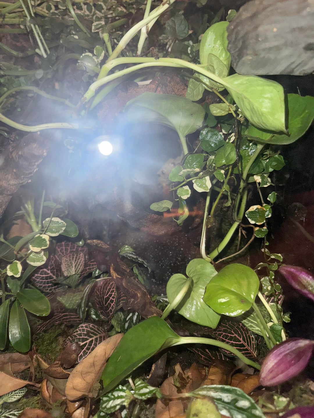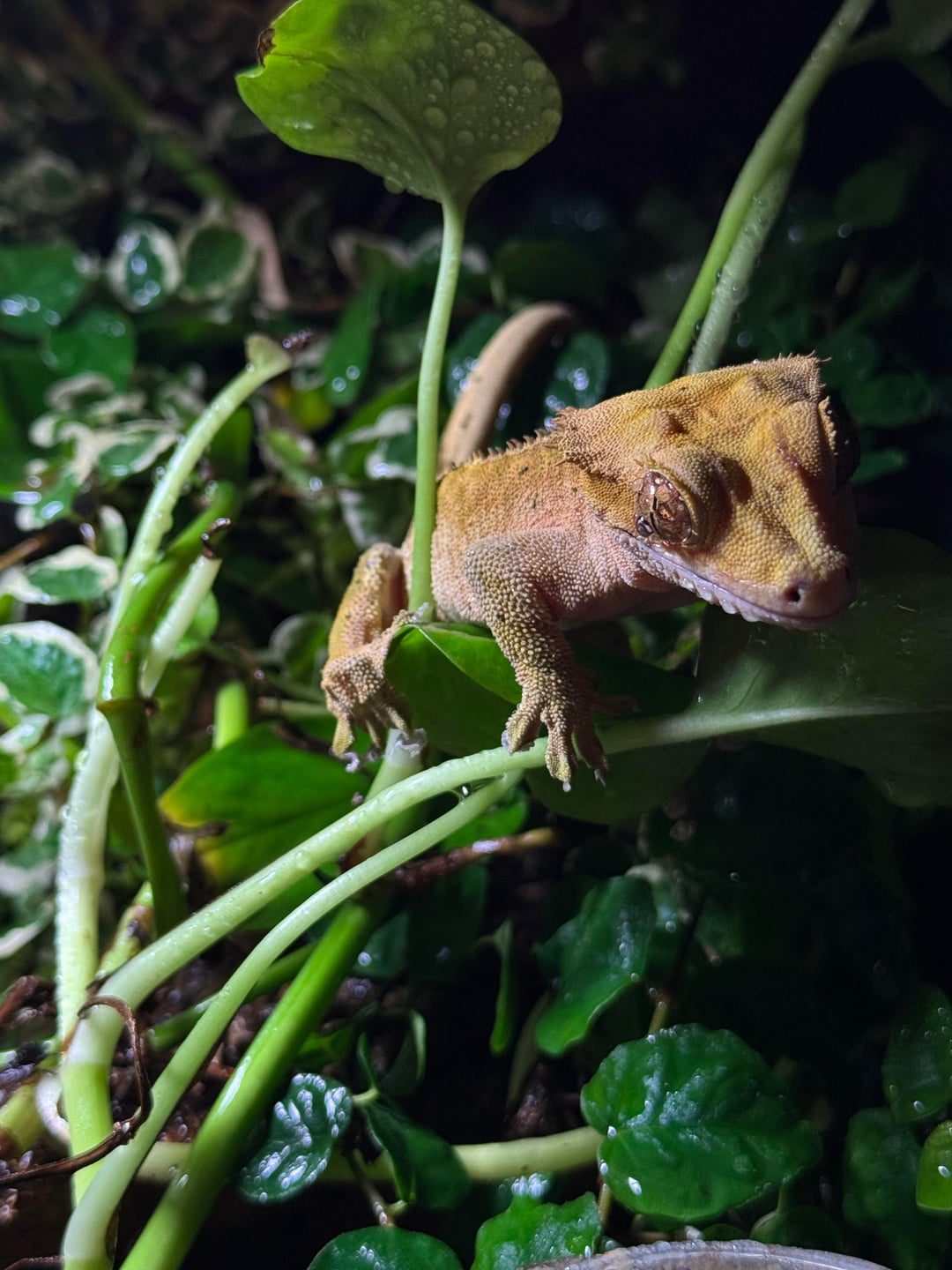 Just went to the reptile expo and managed to get a great price of 100 dollars for this 18x18x24 exoterra with a cork background and the sides painted black. It all was previously rigged for a paludarium with a water feature and had a lot of pothos that grew into the water under the low light that was previously on it. I added and changed a lot of elements to the barebones hardscape that was there and then added substrate, lush moss, and planted it with 9 other species. Hopefully they can hold up against my huge male crested gecko who has a tendency to trample acclimating plants – we will see. I think he loves the hides and additional privacy this tank has because he was very aggressive previously probably due to feeling exposed in the previous set up I had for him which was too small and sparse. Only time will tell, you can see him hiding deep in the cave in the last picture!