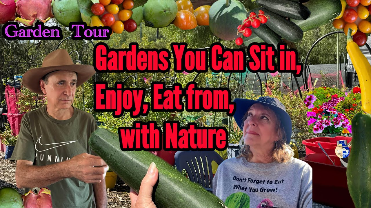 on such a gorgeous day. Maybe we need a garden tour. And maybe I’ll walk you through this time instead of just being always behind the camera, which I prefer. I’ll be more in the front with maybe some guests that live on the property here with me. November 1st. Ready for a garden tour. Hi, it’s Robbie from Southern California. Oh my goodness. Let’s go through the different gardens I’ve got because I garden differently all throughout the yard. Now, this one is the chair garden. And you know how I do that? Chairs I got for free, painted them up, and put some totes on there. This is my favorite garden. If I had only one garden to do and for whatever reason, whether I moved into a small place or decided I don’t want to grow that much because I don’t need all these gardens. I want to do something else. I want to go back to work and do a 9-to-five job or whatever. What garden would I do? And it would be this one. This is pretty much maintained on its own. It is the easiest garden to do. It’s the easiest garden to put together. We can get into details another time, but each container, each tote here is its own garden, its own entity. If this would have been one large garden, then I have to cater to the whole thing and put the whole thing together at one time. You’d have to fill the whole container full of soil and then you would have to water the entire thing. You can leave part of it dry. Doing it this way, it’s its own garden. So I can grow here like all this beautiful brassica. This is a purple tree collarded and you don’t throw anything away. We’ll get back to that in a minute. I can grow that there. I can put in other pots and layer and grow parsley or different things with it. Each one, this one was full of tomatoes. Now it’s got Malibar spinach. Then I’ve got I had squash all through here and tomatoes and red vein soro and green soro and celery. In other words, I garden at my own pace, which makes this garden one of my most favorite. If one plant needed more water than another plant, let’s say peppers, they like to get a little bit dry sometimes, but let maybe your brassacas or your tomato plants or your watermelon need more water. Then you would separate those plants and you would have different plants growing in a different container. These are 18gallon totes. Then you can cater to each individual plant and at the same time you can layer. So if I had to pick and we’re going to walk through and see all the different gardens I’ve got here. What garden would be my favorite? It would be this one. Favorite as far as growing food. I’ve got other gardens that are my favorite because it brings in nature. Does this bring in nature? Of course it does. But this entire little garden that takes me less than five minutes to water, so quick to set up, so easy to maintain. This is my favorite vegetable garden. And you’ve watched it grow from 2020 to this, and every year it’s different. I’ve done watermelon all through here, all different squash. I had okra once, just everything growing in here. And it’s just, well, what can I say? It’s easy. Let’s keep going and then ask questions on each type of garden because I know I’m not going to be able to get into every single thing I do. And I’m going to forget because we’re kind of doing a beautiful walkth through on this day. My goodness, it’s been warm and blue skies and we’ll see how long this lasts for. But the point is, every garden is different. And I want you to come through my gardens and look at it and say, I like that. I can do that. Maybe I’m not going to put as many chairs. Maybe I’m going to do more chairs. There’s no bending. Everything is right at my fingertips. And even to break all this off here, this tomato plant is done. I’m going to break this off and compost it. Where? Well, right now I put it in a bucket and I keep it here and keep pulling off what is not growing. But if I wanted to, I could throw it right back in there. Now, as far as what else do I do to amend the soil? Nothing. I continue to take everything off and put it right back and let it do as nature all around this does. The leaves fall, they decay, and build soil. I would never spray it or put any type of insecticide in there. That would not work for here because we have so much nature here. It would wipe out the entire ecosystem. But we can talk about that another time because I do it the way nature does it. And you know, a lot of my garden is grown on the free. Of course, you can buy plant food and all that. That’s up to you. But this is the way I do it. This is the way I’ve been doing it for years. And let me tell you something. We have a freezer full of food. And I didn’t freeze everything. I just kind of selectively went through. I froze a lot of it. We’ve been eating a lot of it. And we also compost a lot of it. We put back what it pulled out and it will feed the next set of plants, the next generation from what it gathered here. Let’s keep going. I have Malibar spinach growing through here. Big leaves. So this is the garden. These tables I set up for ginger and turmeric. Now most of it here is turmeric. I had my ginger somewhere else. This is ginger. As you may or may not notice, my leaves are starting to turn yellow and some of them are turning brown. Now this is what happens this time of the year. This is normal. And I’m thinking harvest time is probably about a month away. I’ve been taking care of it here. It’s all been growing. It’s been doing really good. They’re quite tall and I’m happy with them. But I will say that the ginger struggled this year. Now, we were kind of thinking, why in the world did the ginger not grow as good as the turmeric? Well, we have a room that the dogs go in. Last summer, the room was air conditioned. I would just leave the air conditioning on. They have a doggy door and they go back and forth in that room all they wanted. We had it on for weeks on end