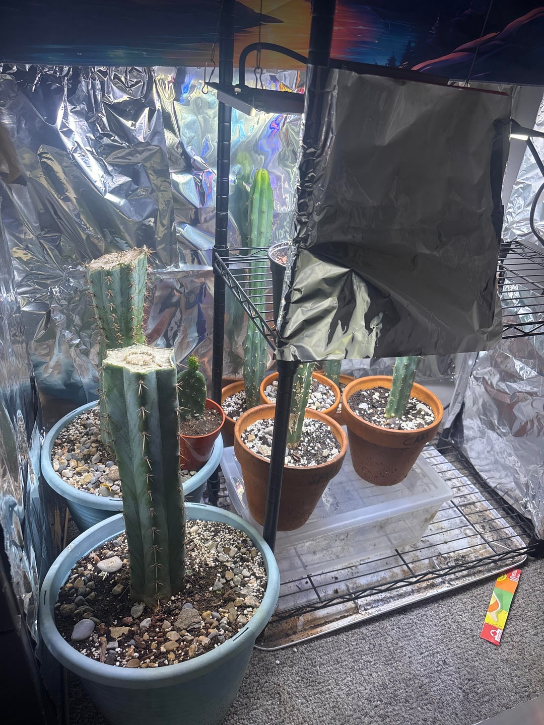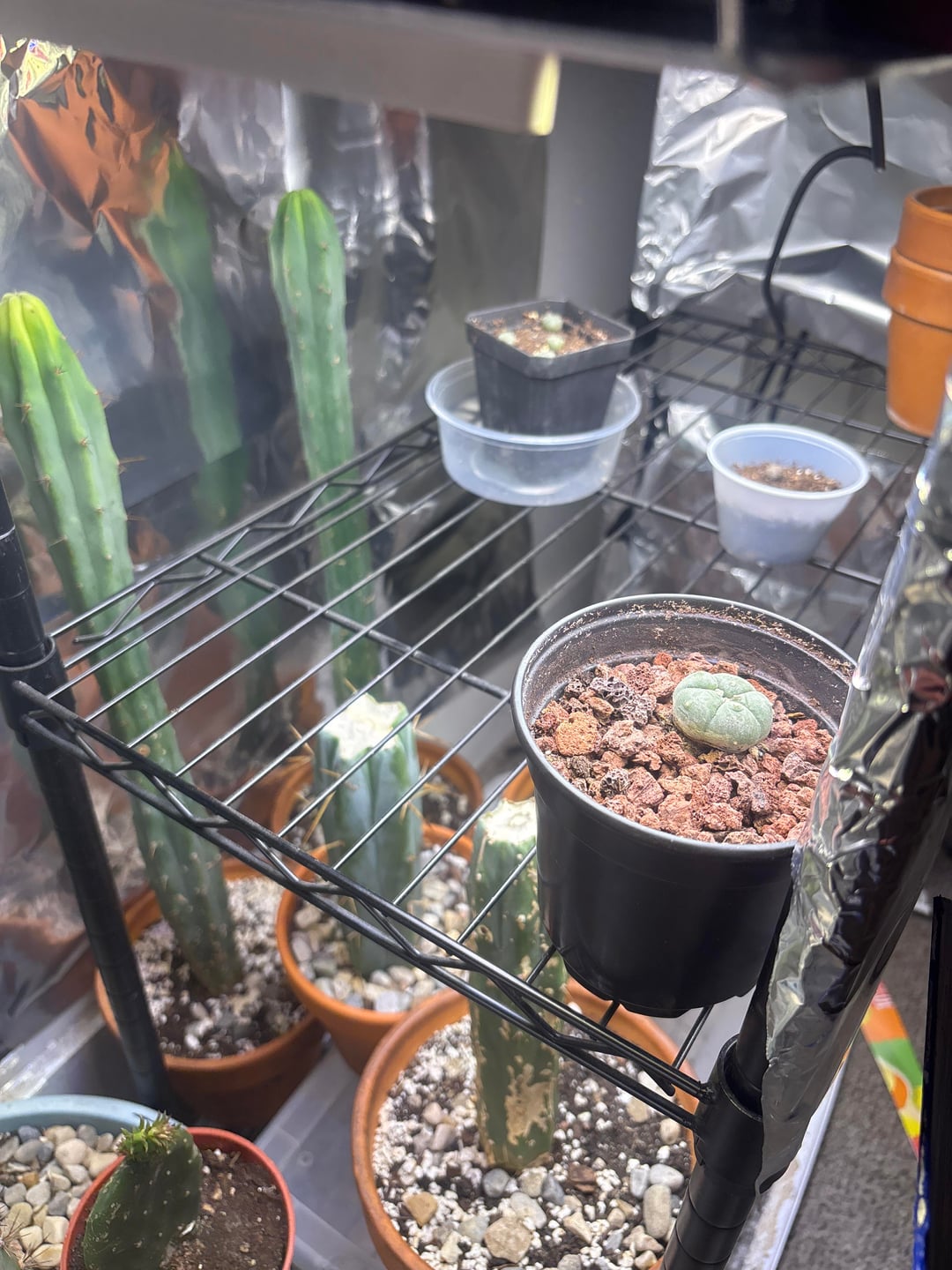 Looking good! From my perspective I would move the trichocerus around so they are getting more direct and strong light. I would move the buttons down to the pot level of the trichocerus. In my experience the trichos will grow thicker and fast in the brighter light , untill they start to yellow and tgen just back off. Buttons dont need to be that close to the light as they usually grow under nurse plants. Either way just watch the plants and respond to any changes you see. Watching them grow is so much fun! Best of luck!