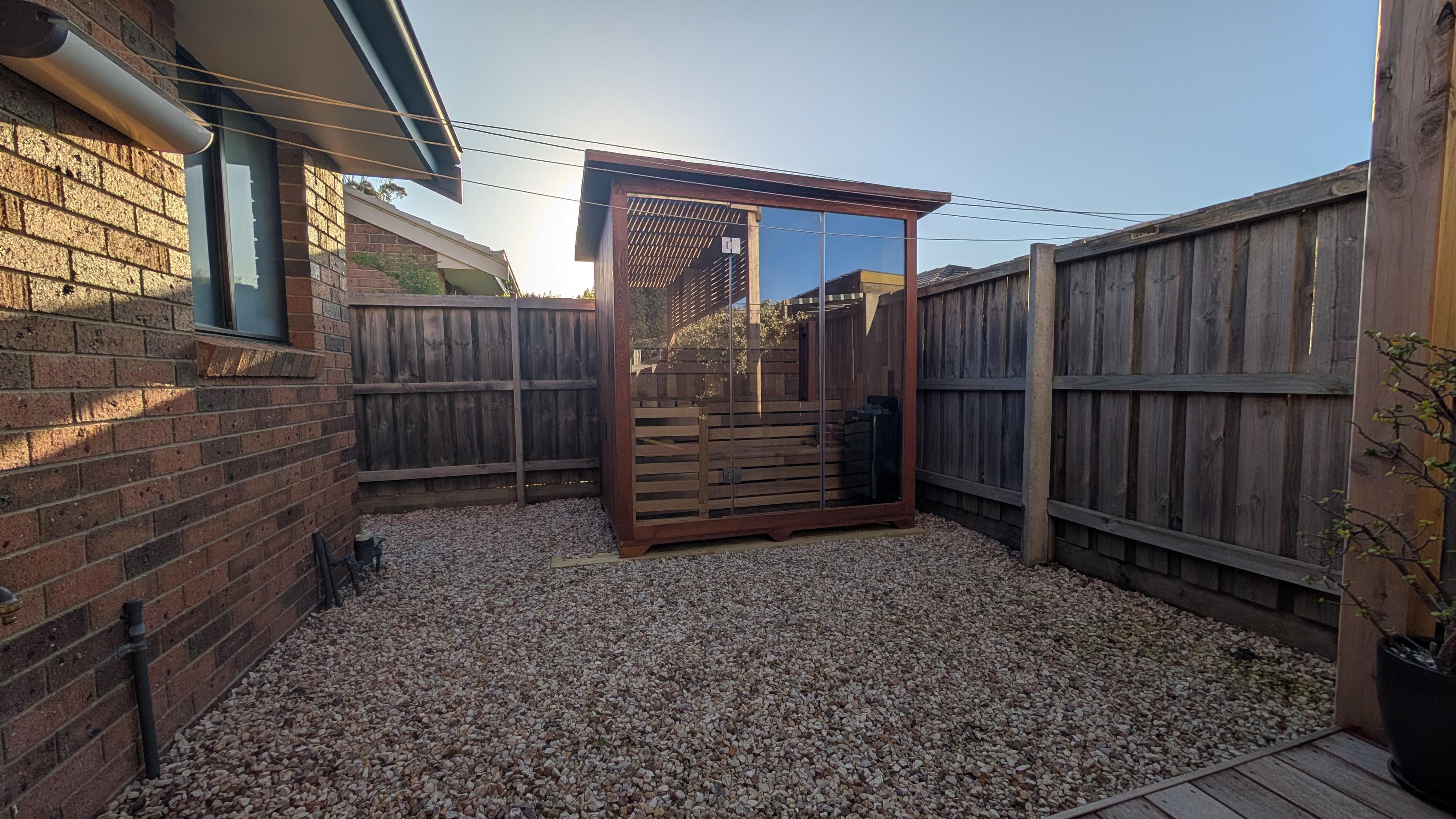 There's a lot of wood, brick and rock going on here. The obvious answer is to add some plants but i'm not sure where / what kind. Maybe a few lilly pillys? The sauna has a full glass front which is nice at night but during the day I just sit there looking back at the house. Some sort of screening would be nice.