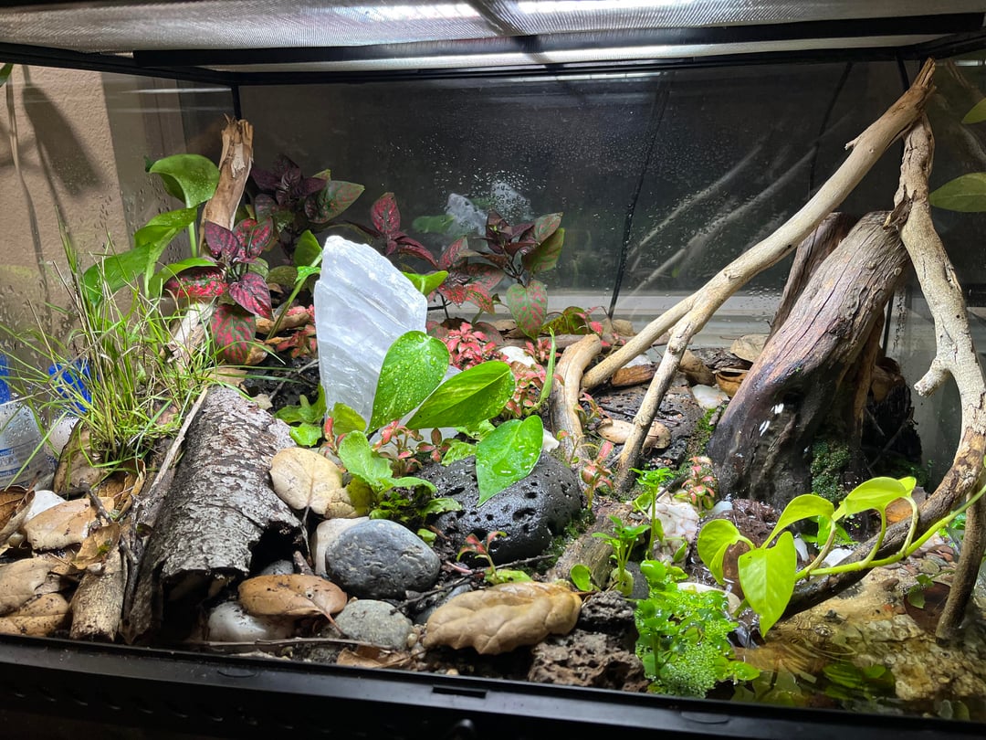 These polka dot plants and fittonia will hopefully make a nice bushy hide for my frogs. I’ll update when things grow in. by BunchesOfCrunches paludarium 1 Comment BiotopesAreDope 1 month ago Beautiful set up!