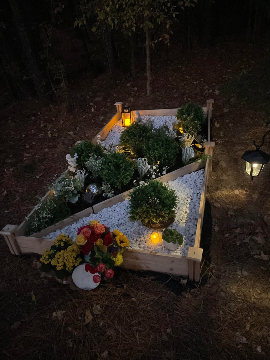 A few weeks ago I posted asking for flowers for my recently deceased pet. He meant the world to me and what may seem overboard gave me a lot of peace and comfort knowing he will always have a nice resting spot. I chose to do faux flowers and plants for the rock garden and plan to do wildflowers and such surrounding the area for him. I wanted him to at the very least always have the rock garden in case my gardening skills turn out to be terrible.