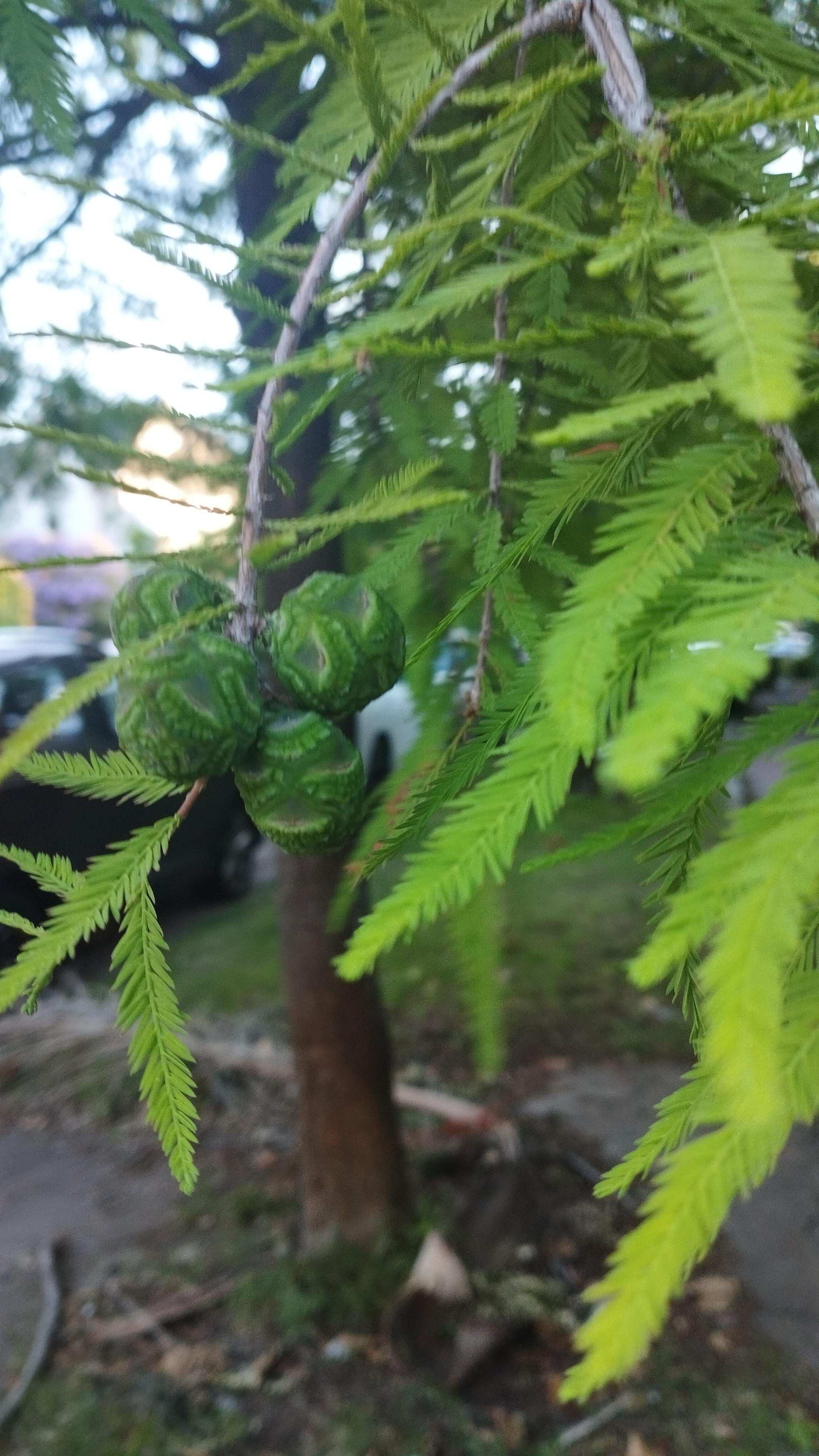 honeysprout 4 months ago Those are cones, they contain the seeds from the tree! They aren’t ripe yet though so they’re still closed and green. This looks like a cypress, maybe a bald cypress? Hopefully someone can chime in with a better ID