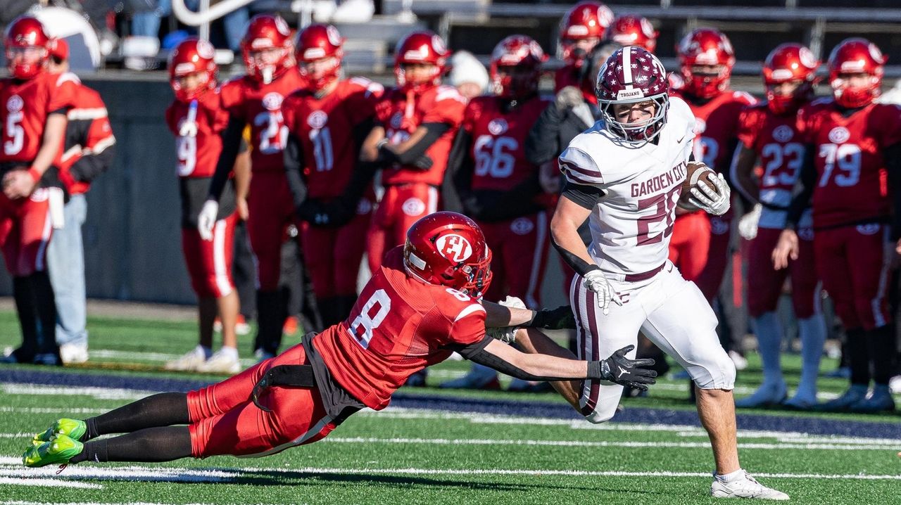 Will Mattice of Garden City tackles Jake Simmons of East Islip at the 20-yard line in the fourth quarter preventing a touchdown in the Long Island Class II football championship on Saturday at Stony Brook University.