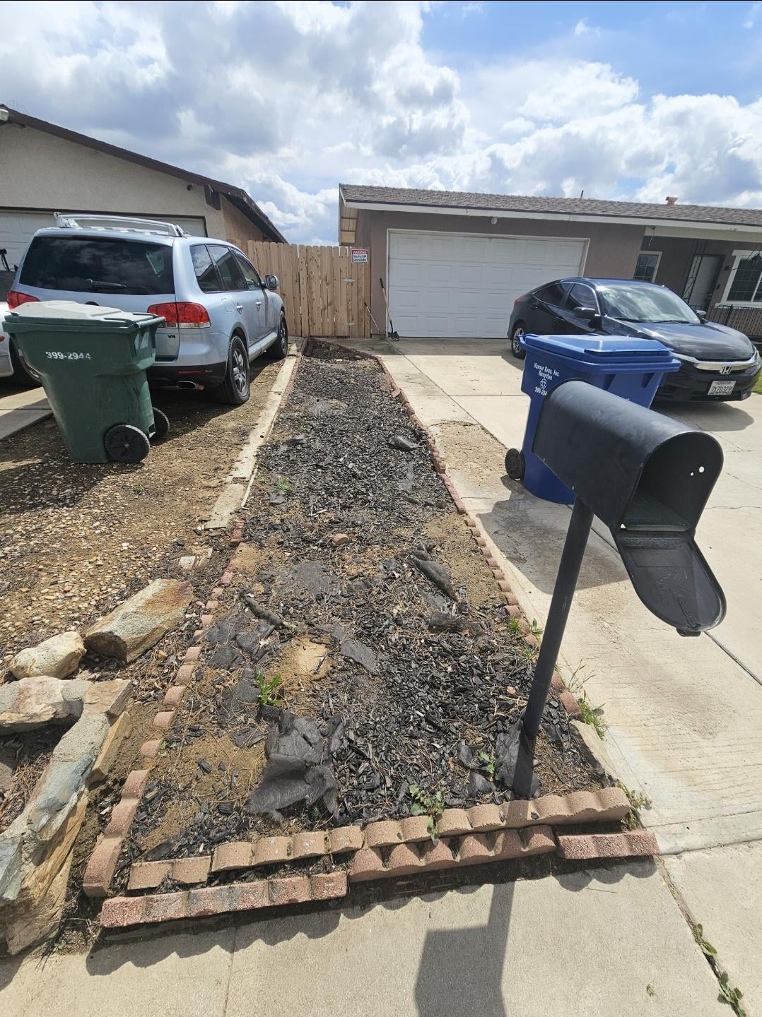 If you want a space for trash bins, put them in front of the gate hidden from the street by bird of paradise from Costco. Wait a month for Costco to carry all things garden and plants.
