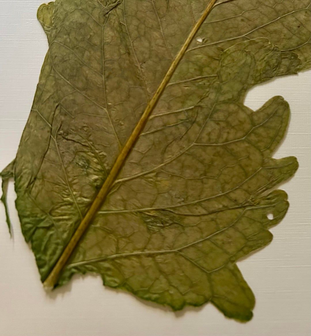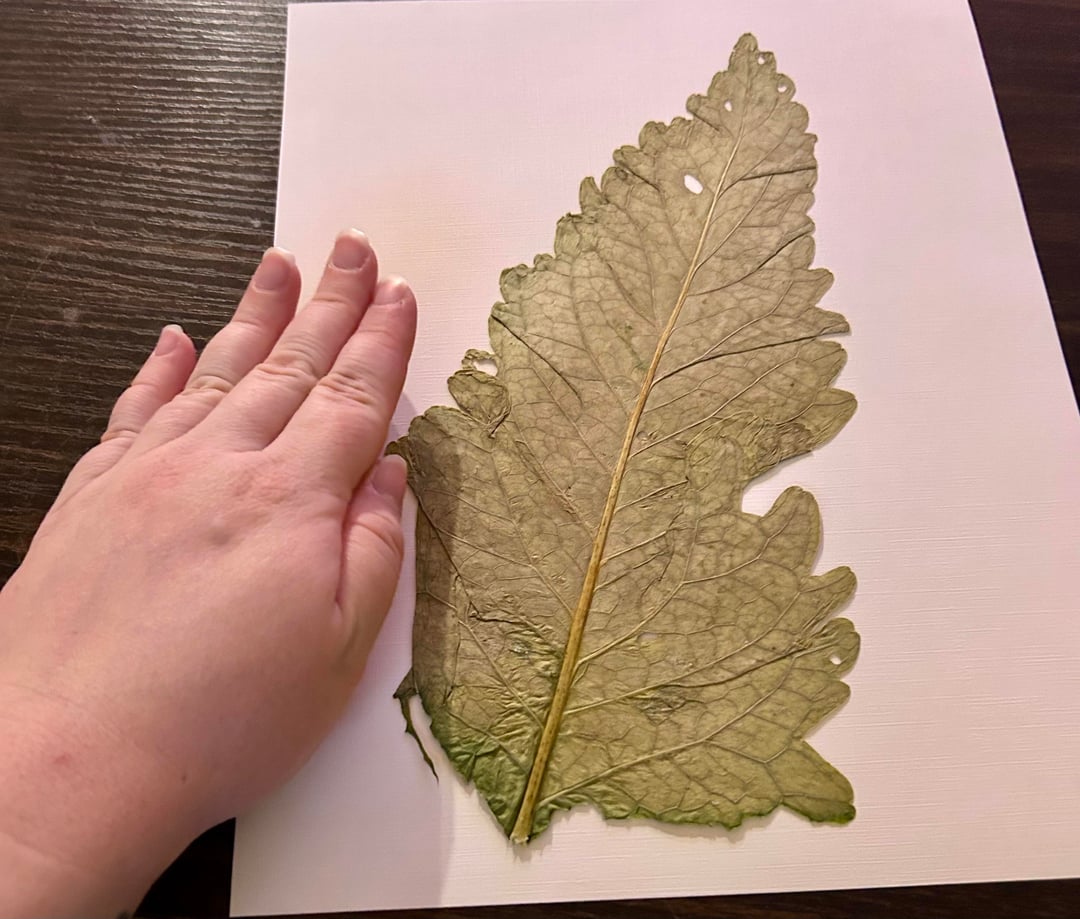 I pulled the leaf off a large plant. There was no flowers on the plant. It looked almost like collared greens. The whole leaf is longer than what is pictured. I couldn’t fit the entire leaf on the page. I’m in the southwestern part of Idaho in the US.